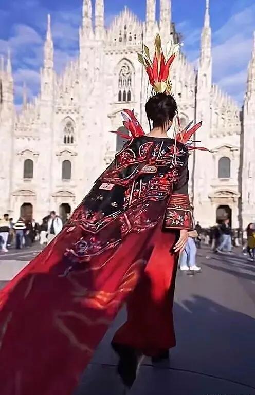 蓝盈莹穿畲族战袍在米兰杀疯了! 米兰街头,蓝盈莹一身畲族战袍太吸睛!黑金红配