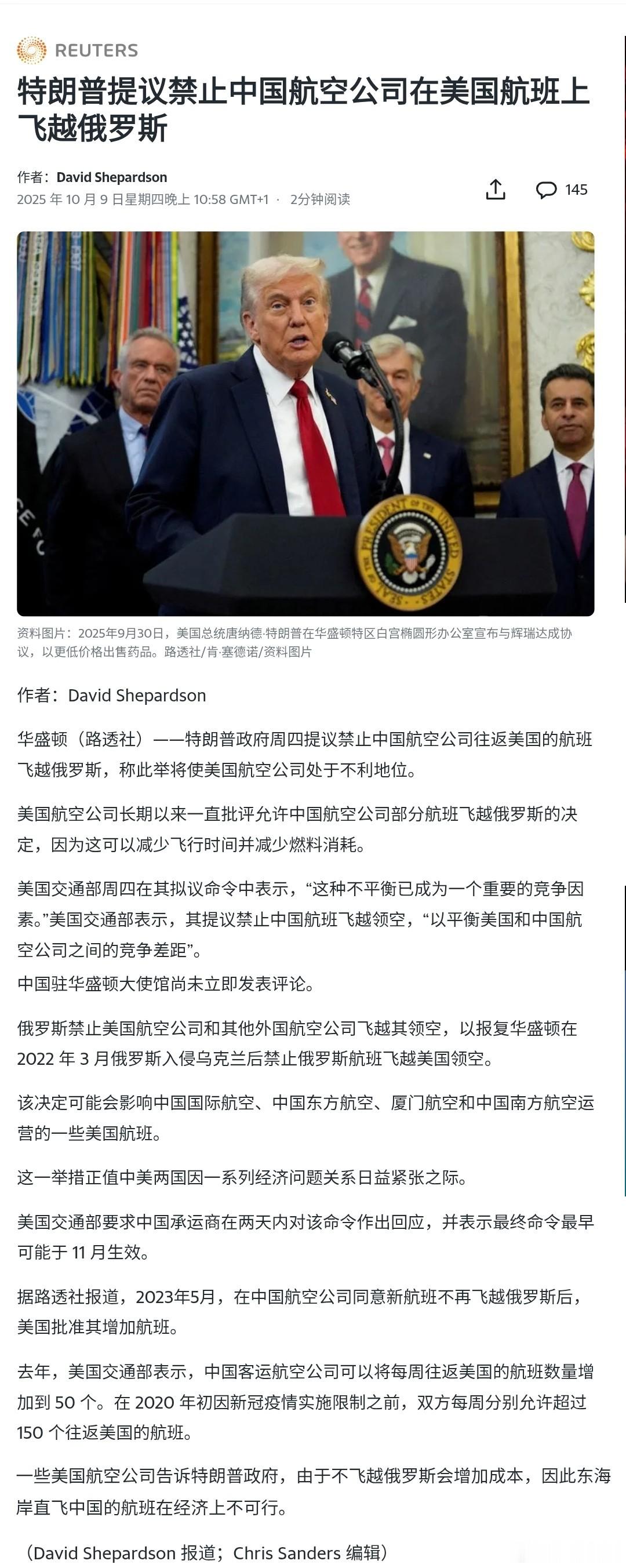 【特朗普提议禁止中国航空公司往返美国航班飞越俄罗斯】