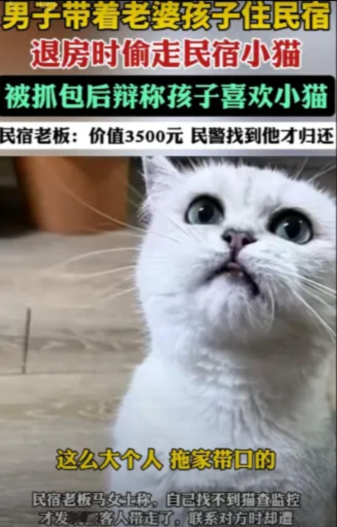 世界之大无奇不有!河南洛阳发生一起令人匪夷所思的事件:一家人入住民宿,临走时竟然顺走了民宿里的一只猫,价值3500元。 当民宿老板查监控发现自己的猫被偷走了,连忙打电话给入住的客人,没想到对方将自己拉黑了,于是民宿老板无奈之下报警处理。 民警赶到现场后,调取了监控,发现入住的男客人在民宿里逗了一会儿猫,抱着猫走出了大门。 民警通过警方系统联系到了男客,没想到男客竟然提出让民宿老板自己去高速口接猫回来!民警问其为何要偷走猫,男客给出的理由是:“孩子喜欢这个猫”。 最终经过民警和民宿老板的耐心沟通,男客最终将猫还了回来,但带回的猫状态不佳,而且发现有受伤的痕迹。 这男客的行为已经触犯盗窃罪了,民宿老板完全可以依法追究其刑事责任,但民宿老板表示不追究了,只要求赔偿200元的猫粮费用。 事件发生后,引发网友热议,有网友说:家长就是孩子的第一任老师,孩子最先学习的价值观来自于家长,家长做错了示范,孩子将来也会做错。 也有网友说:偷东西被抓了,就说是为了孩子,这理由也太牵强了吧? 对此,你们怎么看呢?欢迎评论区留言讨论![比心] 河南奇葩事件