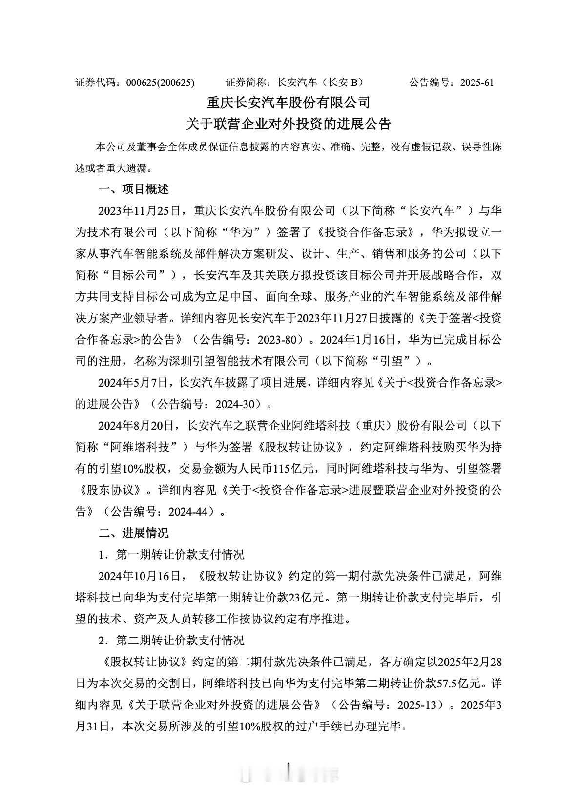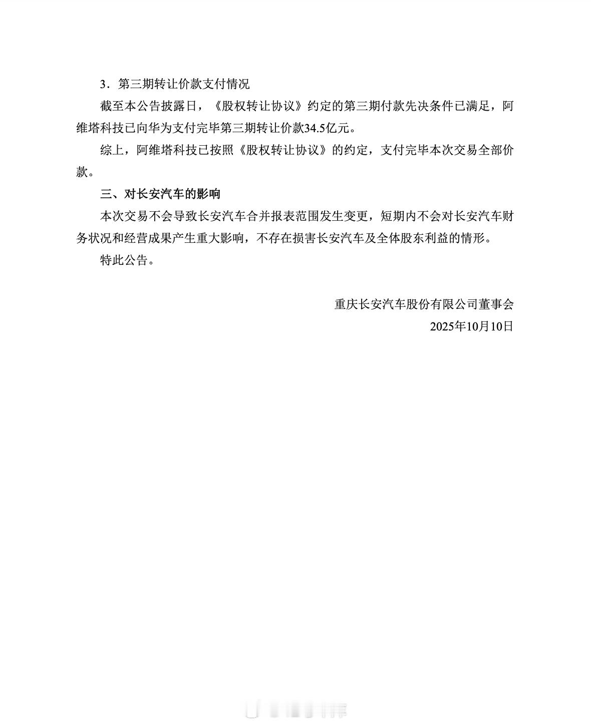截至本公告披露日,阿维塔科技已向华为支付完毕第三期转让价款 34.5 亿元,已支付完毕本次交易全部价款。