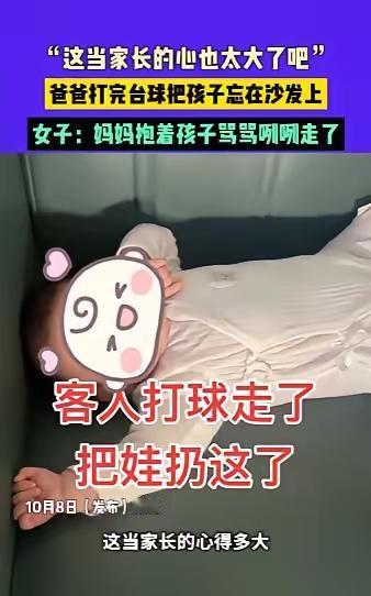 “这也太离谱了吧!”10月8日,在浙江,一名男子打完台球后,竟把几个月大的孩子忘在沙发上,独自离开了。妻子心急如焚地赶到台球厅找孩子,抱着孩子对男子一顿数落。网友直呼:这亲爹也太不靠谱了! 此事着实令人震惊与愤慨。该事件暴露出家庭责任感的严重缺位,也引发了公众对父母责任和儿童安全问题的关注。几个月大的婴儿十分脆弱,父母稍有疏忽,便可能造成严重后果。 事件的核心问题如下: 父母责任心淡薄:男子打完台球后居然忘了带走孩子,足见其对孩子的关心和责任感严重不足。 家庭教育与监护:家庭成员需共同努力,保障孩子安全,避免此类疏忽发生。 社会关注:公众和相关机构应强化对儿童安全的关注,宣传父母责任的重要性。 希望这位父亲能意识到自己的错误,汲取教训。也期望社会能加强对育儿责任的宣传和引导,守护每一个孩子的安全。