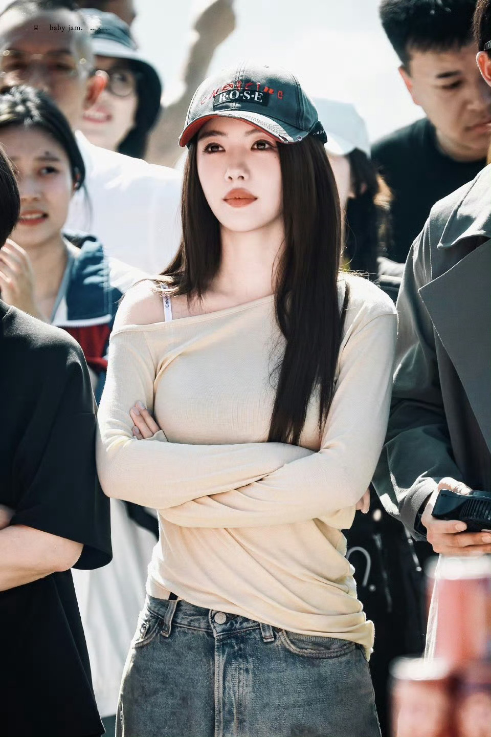 蔡文静新剧开机路透蔡文静开机路透状态绝了!棒球帽配露肩针织衫,简约穿搭难掩清新气