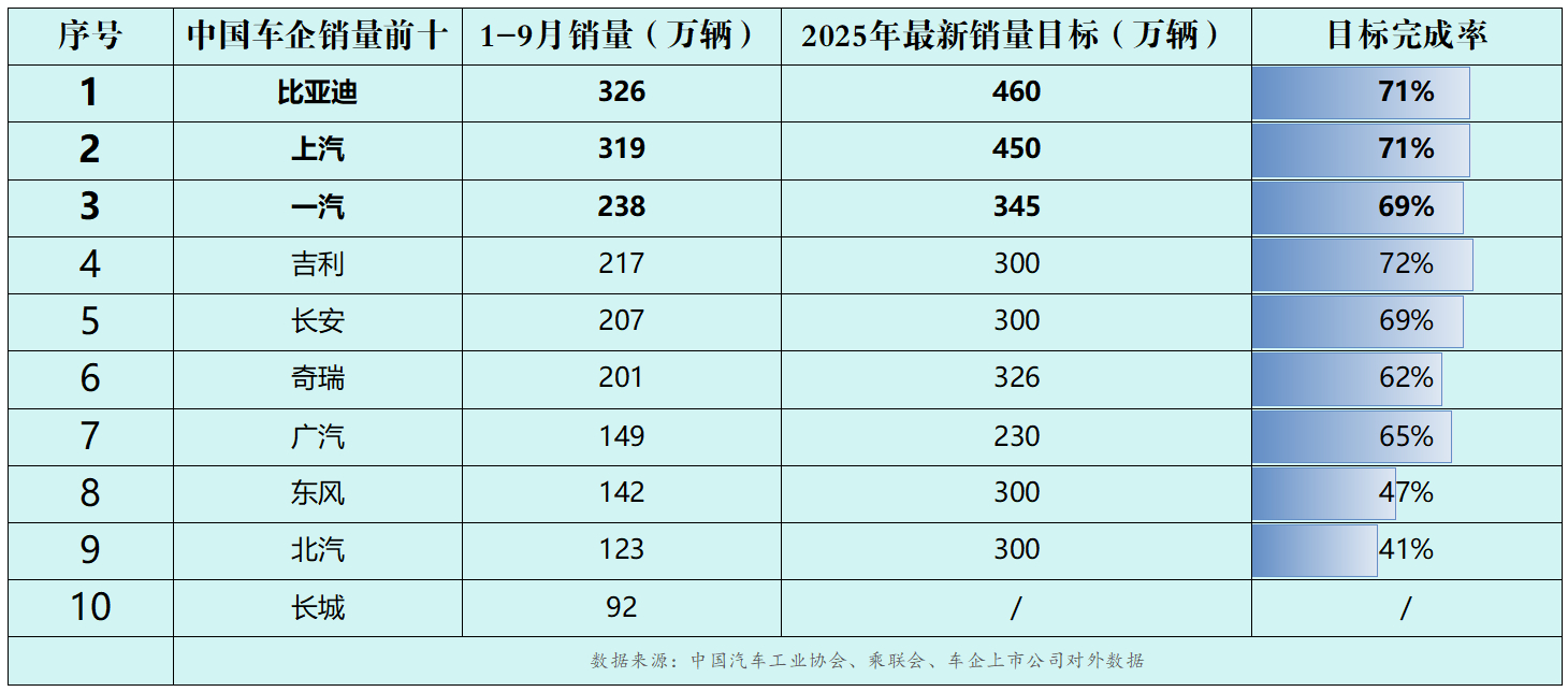 其中,其中比亚迪全年目标460万完成率71%;上汽全年目标450万完成率71%、一汽全年目标345万完成率69%、吉利全年目标300万完成率72%。