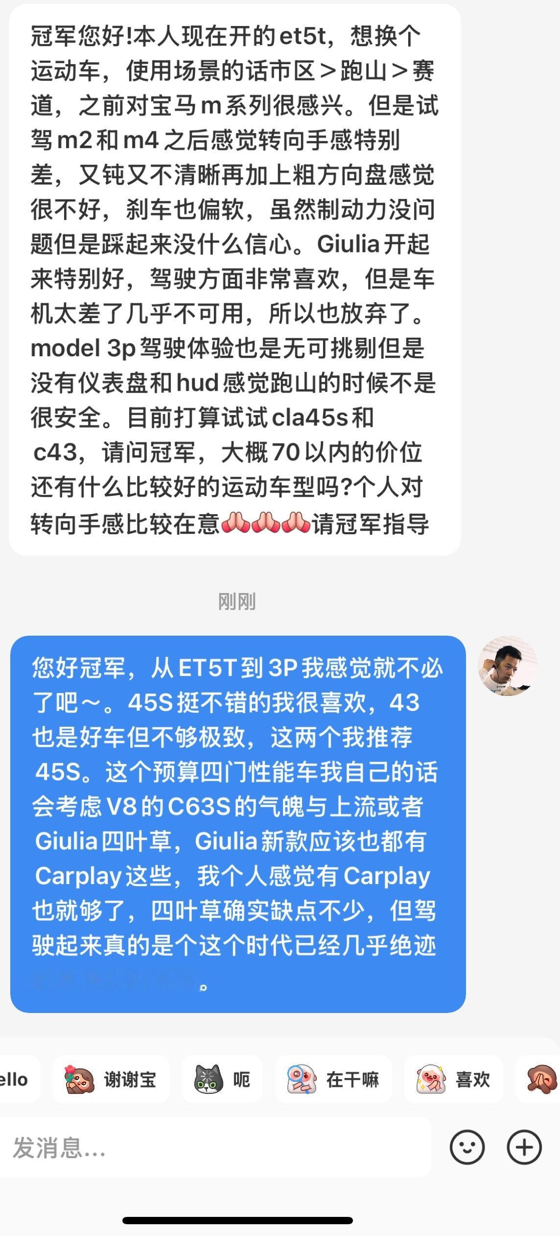 45S挺不错的我很喜欢,43也是好车但不够极致,这两个我推荐45S。这个预算四门性能车我自己的话会考虑V8的C63S的气魄与上流,或者Giulia四叶草。Giulia新款应该也都有Carplay这些,我个人感觉有Carplay也就够了。四叶草确实缺点不少,但驾驶起来真的是个这个时代已经几乎绝迹的很纯真的性能好车。