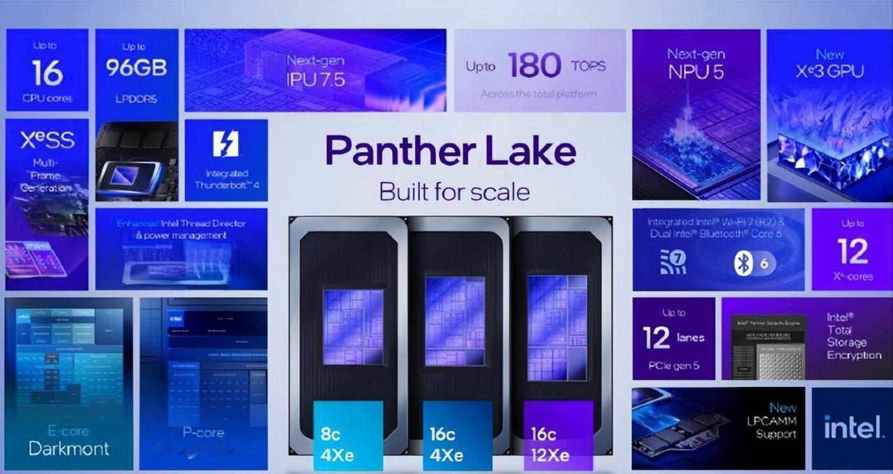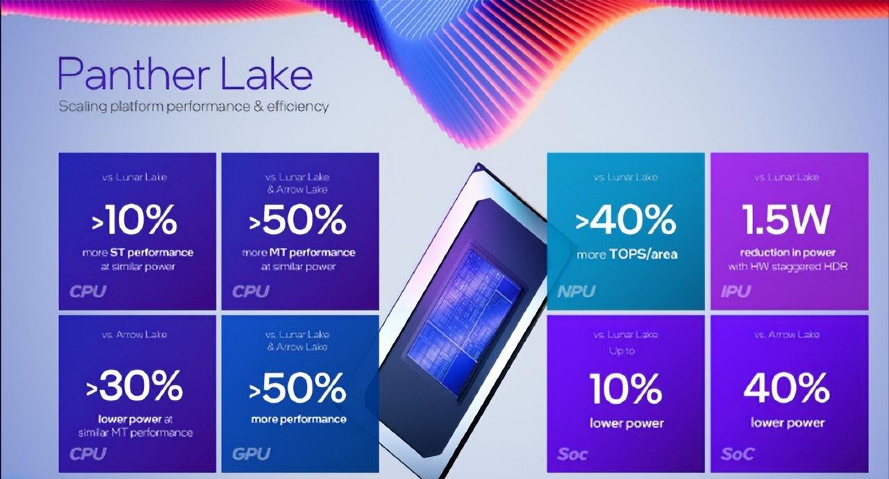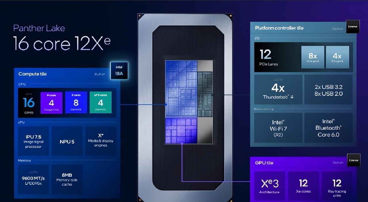 2nm的处理器终于来了!没想到是英特尔抢先发布[奸笑] 英特尔近日公布第三代酷睿Ultra处理器Panther Lake架构细节,以及同采用Intel 18A制程的至强6+(Clearwater Forest),都是由亚利桑那Fab 52新工厂生产,Panther Lake今年晚些时候出货。 18A制程搭RibbonFET晶体管与背面供电技术,能效和芯片密度提升。Panther Lake瞄准AI PC,180TOPS算力支撑多场景;Clearwater Forest聚焦数据中心。 Panther Lake 在多核规模更小的情况下,同性能功耗对比Arrow Lake下降30%!旗舰配置是16核(4+8+4)CPU。目前只出了针对移动端的Panther Lake和针对服务器的至强6+,桌面端还没上。如果到时候出桌面端了,你们会考虑嘛?