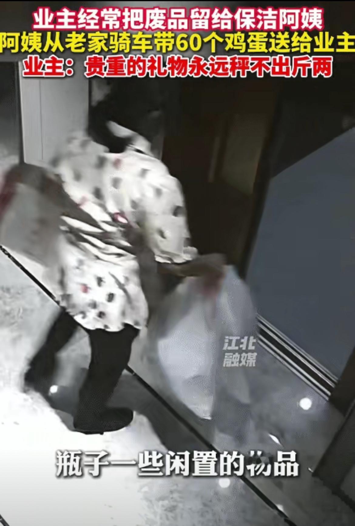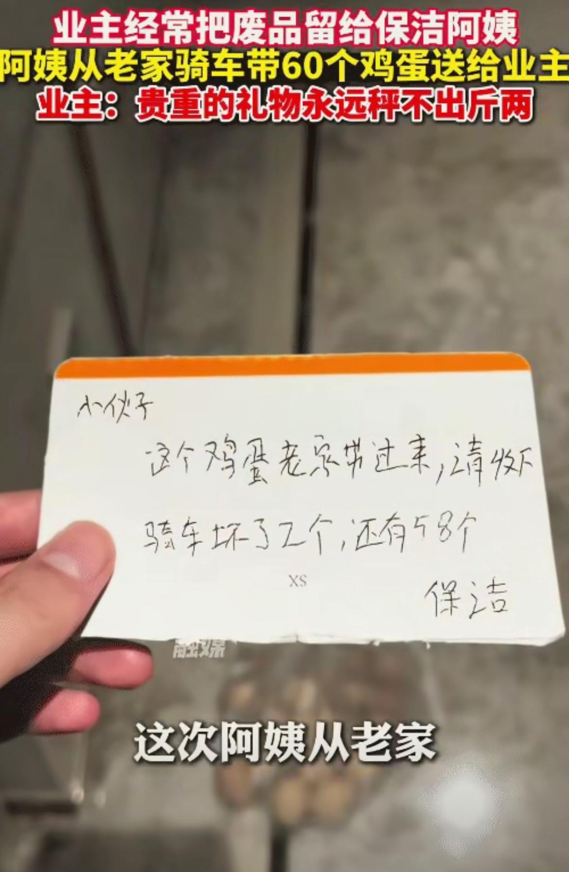 暖心!近日,江苏南京,男子经常把废品留给保洁阿姨。没想到,假期回来,在门口发现两袋土鸡蛋和一张纸条。他看了纸条后才知是保洁阿姨送的。他感叹: 贵重的礼物永远秤不出斤两。网友: 双向奔赴的善良。 曹先生(化名)在国庆假期的前几天就请好了假,买好了返程的火车票。 工作了一整年,他早就盼着这几天能回家看看。 假期结束那天,曹先生拖着行李回到家,还没掏钥匙开门,就注意到门口放着两袋土鸡蛋,袋子上还压着一张纸条。 塑料袋外面沾着点灰,显然是放了有一阵子。 他弯下腰捡起来,看清纸条上歪歪扭扭的字:“小曹,这鸡蛋是家里自己养的鸡下的,拿着尝尝。”落款是一串熟悉的名字——保洁阿姨。 他愣了好一会儿,心里忽然有点酸。原来那位在走廊里总是笑眯眯、头发花白的保洁阿姨,还惦记着他。 平时他家门口常放一些整理出来的旧纸箱、饮料瓶,还有些用不上的小家电给阿姨。 阿姨每次都会轻手轻脚地收走,还会特地把门口扫得干干净净。 这次国庆他回了老家,一走就是一个多星期,本以为没人注意他的离开。 没想到回来第一件事,就是看到这两袋鸡蛋。 那是地地道道的土鸡蛋,颜色不均匀,壳上还带着一点稻草的印子,一看就是自家养的鸡下的。 他拎着袋子进门,心里暖洋洋的。想着那位年纪比自己母亲还大的阿姨,可能是怕鸡蛋坏掉,特地挑了天气凉快的那天送过来,还留了张字条。 曹先生看着那几个不太工整的字,忍不住笑了笑,心里却比拿到什么贵重礼物都感动。 网友也表示我也是经常把些废品送给做保洁的大姐,她也会送我些从农村带回来的菜什么的。人都是双向的。都会知恩图报的。