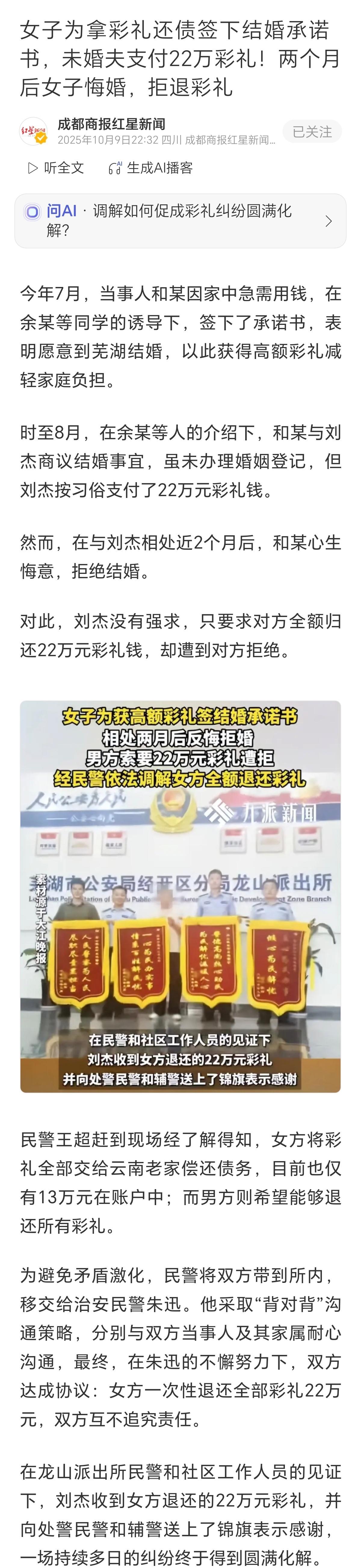 因为遇到正经警察,集美们第一次创业失败。 据报道,一女生为拿彩礼还债,签下婚姻承诺书。 结果,在拿到22万彩礼后仅2个月,就心生悔意,拒绝结婚。 男生见状,也没有强求,只是要求退还彩礼。 女生不愿,警方介入调解后,双方达成协议: 女方一次性退还全部彩礼,双方互不追究责任。