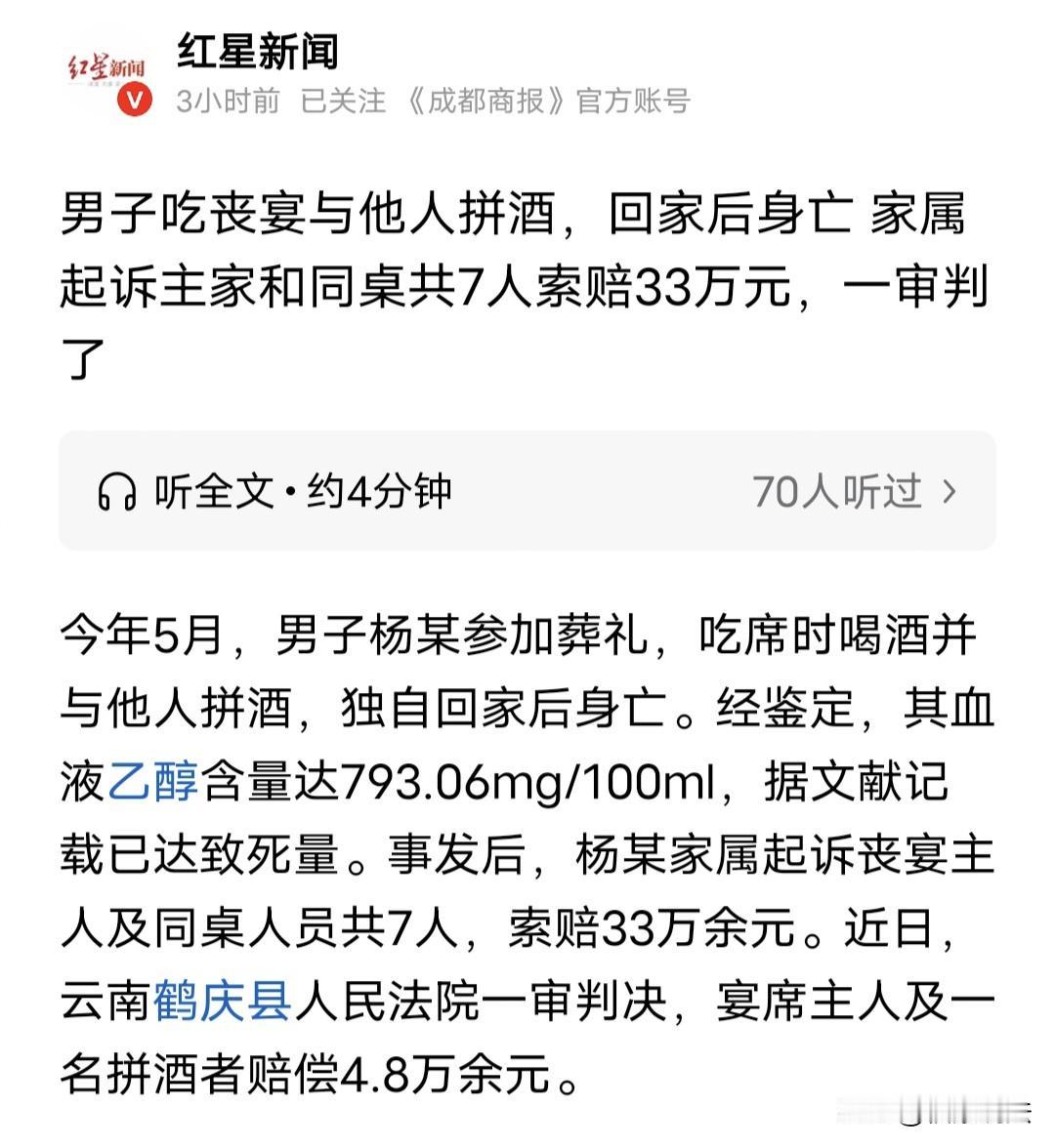 云南,男子参加丧宴,和他人拼酒大吵了几句,独自一人离开,第2天下午,其家属发现男子躺在家里门内,身体都硬了,家属报警,男子疑似酒后死亡,血液中乙醇含量达致死量793.06mg/100ml,男子家属拒绝尸检,事后,一纸诉状将丧宴主人和同桌6人告上法院,索赔33万元,一审这样判了。 2025年5月5日这天,母某甲给去世的母亲办了葬礼仪式,准备的晚饭是自助餐形式,来往的宾客可以自选饭、菜,酒水自便。 这天晚上5点半左右,杨某听说了母某甲家办丧事,就来到他家吃饭,一来是人情往来,二来也是捧个人场。 然而,杨某吃饭的时候和母某乙不怎么凑到了一块,两人喝着酒,越喝越来劲儿,可能是酒精上头,两人一言不合还发生了言语冲突。 到了晚上7点40多,杨某已经酒足饭饱,心情不爽他,一个人从母某甲的家里离开了。 谁曾想,杨某这一走就没了动静,一场悲剧也在悄然而至。 5月6号下午,杨某的家属回家后,就看到杨某一个人躺在大门里面的水缸旁边。 家属意识到不对劲,赶紧上前查看,发现杨某全身都僵硬了,吓得够呛,急忙报警。 民警到了现场后,发现杨某是倒在门内,四肢僵硬,疑似酒后死亡。 经过鉴定,杨某血液中乙醇含量为793.06mg/100ml,已经达到了致死量。 但是,杨某家属拒绝尸检,所以,杨某具体的死因没有办法确定。 杨某家属悲痛欲绝,好好的一个人说没就没了,虽然酒喝的多,但是,母某甲家办丧宴没有照顾好杨某有一定的责任,和他同桌喝酒的人也有责任。 因此,杨某家属将母某甲和同桌人员一共7人告上法院,索赔33万余元。 这件事就大了,母某甲本来是为去世母亲办丧宴,用自助餐形式宴客,酒水自便,他作为主家当然不希望这种事情发生,但是,杨某家属认为他没有尽到杨某醉酒情况,也没有尽到安全保障义务。 不过,此事还有一个关键,就是杨某和母某乙拼酒并发生言语冲突,那么,母某乙与其拼酒,是不是也该承担一些责任呢? 法院会怎么判呢? 1、母某乙作为拼酒者,需要承担法律责任吗? 《民法典》第1165条规定:行为人因过错侵害他人民事权益造成损害的,应当承担侵权责任。 母某乙作为拼酒者,明知过量饮酒可能会危及生命,却仍与杨某进行拼酒,导致杨某血液酒精含量达致死量793.06mg/100ml。 母某乙拼酒行为与杨某死亡存在因果关系,法院认为母某乙存在过错,需要承担3%的赔偿责任。 2、母某甲作为宴席组织者,也未尽到安全保障义务,要承担次要责任。 《民法典》第1198条规定:宾馆、商场、银行、车站、机场、体育场馆、娱乐场所等经营场所、公共场所的经营者、管理者或者群众性活动的组织者,未尽到安全保障义务,造成他人损害的,应当承担侵权责任。 母某甲作为丧宴组织者,虽未直接参与拼酒,但提供了酒水并允许自助饮酒。 而且,母某甲没有对杨某的醉酒状态进行劝阻或安全护送,未尽到“合理限度范围内的安全保障义务”。法院认定其需承担2%的赔偿责任。 组织宴会或者酒局的组织者的义务包括:提醒适量饮酒、劝阻过度饮酒、对醉酒者进行护送或通知家属。如果没有尽到上述义务,需要承担次要责任。 3、杨某作为成年人,要对自己过量饮酒的行为承担主要责任。 杨某作为成年人,对自身身体状况、酒量及饮酒后果具有完全的认知能力,他应该知道自己的酒量,并控制量,且少喝。 然而,杨某的血液乙醇含量高达793.06mg/100ml(达致死量),这表明其他主动或放任饮酒至危险程度,未履行对自身安全的注意义务。 杨某与母某乙拼酒本身就是将自己置于危险之中。 法院认为,杨某需承担主要责任,因其拼酒、以及独自离开的行为是死亡后果的直接原因。 4、同桌其他5人无需担责。 法院未支持杨某家属对同桌5人的索赔请求。 原因有三点,第一,其他同桌人员未参与拼酒,亦无强迫劝酒、恶意灌酒等行为; 第二,杨某的死亡直接源于自身过量饮酒及与母某乙的拼酒行为,与其他人员无直接关联; 第三,若其他人员未发现杨某的异常状态,或已尽到一般社交场合的提醒义务,比如口头劝阻,则无需承担责任。 最终,法院判决:母某乙承担总损失的3%的赔偿责任,赔偿杨某家属28910.61元。 母某甲承担总损失的2%,赔偿杨某家属19273.74元。 其余损失由杨某自行承担。 有人说,都是成年人,吃饭饮酒应有度。像这种嗜酒如命者,你劝他少饮酒?他会跟你急,有可能会引起纷争。 丧事很少有人劝酒,因为孝家是悲痛时期更不会劝人饮酒作乐。 还有人说,东家办丧事,哪有心情管宾客吃饭喝酒的事,要求他对每位宾客的饮酒量精准把控,也没有办法预判宴席间所有潜在风险啊? 对此你怎么看呢? 关注@福康说法 从日常点滴学法律,生活安稳更有底