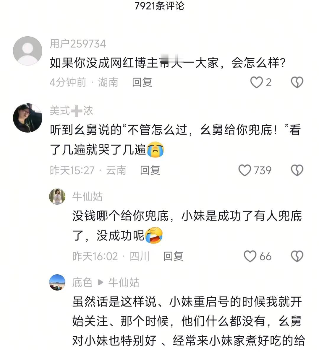 小妹儿已经很难再结婚了 原因很简单 不是因为找不到男人也不是因为有孩子而是因为幺舅说“不管怎么过,幺舅给你兜底”背后已有靠山了,那用得找男人呢 刷到小妹儿生日那视频的时候,我正扒着麻辣烫外卖呢,本来想快进看个热闹,结果刚听到幺舅说“不管怎么过,幺舅给你兜底”,眼泪“唰”就下来了,直接掉汤里——不是吧?谁能想到一句家常话能这么戳人啊!来回看了三遍,每遍都绷不住,最后外卖里的肥牛都凉透了,郁闷!后来翻评论才发现,好多人跟我一样,哭完还感慨“人生哪只靠婚姻啊”,说实话,这话真说到我心坎里了。 视频里小妹儿、幺舅还有两个娃挤在一块儿,蛋糕上的蜡烛亮着,旁边摆着饮料,看着特普通,但就是这种烟火气,比那些网红生日宴还让人暖。网友说“看几遍哭几遍”,我真的太懂了——生活里哪有那么多惊天动地的事儿,能有人说“给你兜底”,比啥都强。之前听我妈说,人这一辈子就像挑担子,有的轻有的重,遇到肯帮你扶一把的,那是积来的缘,现在看来,幺舅就是那扶担子的人,绝绝子! 看评论区有老粉说,从妹儿重启账号就关注了,那时候妹儿家啥都没有,稀了咣当的。结果幺舅天天往她家跑,不是拎着菜就是扛着肉,到了就扎进厨房忙活,变着法儿给妹儿做吃的改善生活。说实话,我之前还觉得亲戚之间能做到不添乱就不错了,结果看幺舅这操作,才知道啥叫“真亲戚”,巴适得板!老粉还说“就老粉才知道这些”,瞬间觉得老粉跟妹儿之间,也有种特别的情分。 本来我以为“兜底”就是说说而已,直到看到老粉扒的这些细节,才明白幺舅不是一时兴起。之前我邻居家姐姐离婚那阵儿,亲戚要么劝“忍忍算了”,要么躲着怕沾麻烦,哪有像幺舅这样实打实干的?现在想想,能遇到这么给力的亲戚,妹儿也算没白受那些苦。不过反过来想,会不会幺舅帮太多,妹儿自己就忘了咋“扛事儿”了?这倒有点让人犯嘀咕。 翻着翻着评论,看到好多人提醒小妹儿“得防着‘小小’”,说“小小”之前背叛过小二娃,保不齐以后也会坑妹儿。本来我还觉得“会不会太敏感了”,结果猛地想起自己之前的事儿——前年我帮过一个朋友,她跟对象闹掰了,我天天拉她吃火锅开导,结果后来她居然挖我手里的客户!那时候我都崩溃了,才明白“能背叛一次就可能有第二次”不是胡扯。 所以看到网友劝小妹儿,我特能理解,毕竟谁也不想再吃一次亏不是?有网友说“自己长个心眼”,这话太实在了。不过话说回来,会不会大家都盯着“小小”的过去,没看到她现在的改变啊?之前听小区张阿姨说“别把人一棍子打死”,虽然我之前被坑过,但这话好像也有点道理,哎,这事儿还真挺纠结的。 除了说“小小”,评论区全是吐槽小二娃的,说他连小妹儿想跟娃过个生日都不答应。我晕!之前看他们俩的视频,还觉得小二娃挺靠谱,结果现在这操作,我和小伙伴都惊呆了!有老粉说“看了这么多年,真是觉得不值”,我也跟着气——小妹儿之前为这个家付出那么多,现在连跟娃过个生日都要被卡着,鬼火戳! 还有人说“小二娃之前都是装的”,说实话,我也有点怀疑,毕竟视频里的样子和现实里的做法差太多了。不过又想,会不会这里面有啥没说的事儿啊?比如娃的抚养权啥的?但不管咋说,不让妈跟娃过生日,这事儿咋整都不占理。之前听我爸说“做人得有底线”,小二娃这事儿,明显是没守住底线吧? 后来跟闺蜜谝闲传,聊到小妹儿这事儿,她说“幺舅再给力,也不能帮一辈子”,我突然就懂了。其实网友提醒防“小小”、吐槽小二娃,都是好心,但最关键的还是小妹儿自己得立住。别光靠别人“兜底”,自己手里有工作、有底气,才是真的稳。之前我那被坑的朋友,后来也是自己搞起了小生意,才慢慢好起来的,所以说“自己的日子自己攥紧”才是真理,你说是吧!