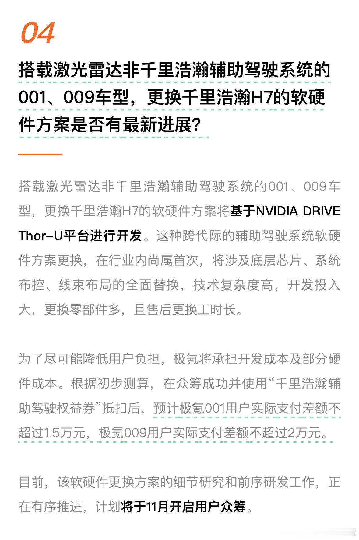 搭载激光雷达非千里浩瀚辅助驾驶系统的极氪001、009车型也能升级千里浩瀚 H7 软硬件方案。