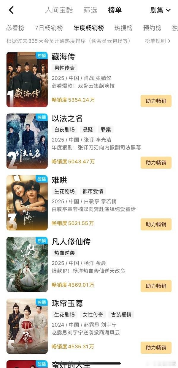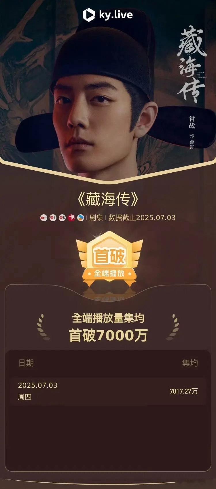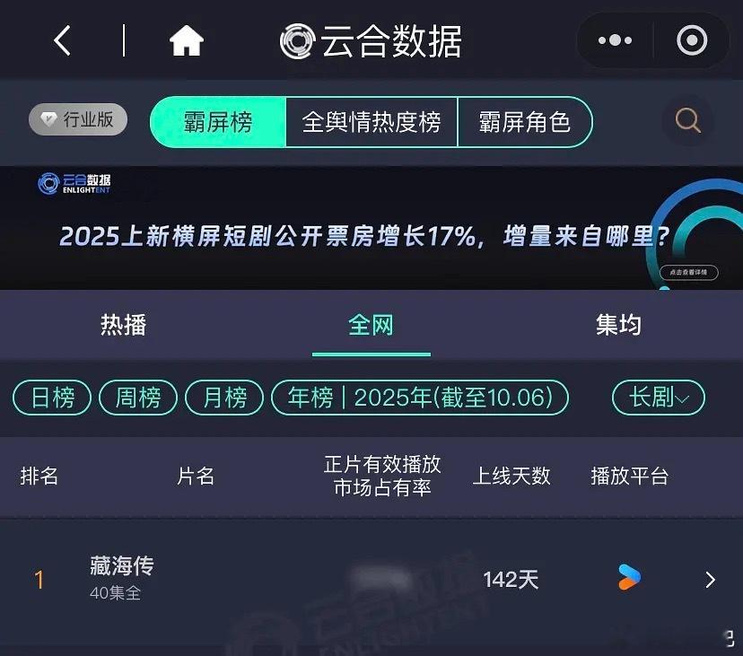 肖战藏海传猫眼热度总榜暂2025年第一,有效总播放量暂2025年第一,同时云合,灯塔总播放量也是暂2025年榜第一,还是优酷拉新年榜第一,热度榜第一[耶]
