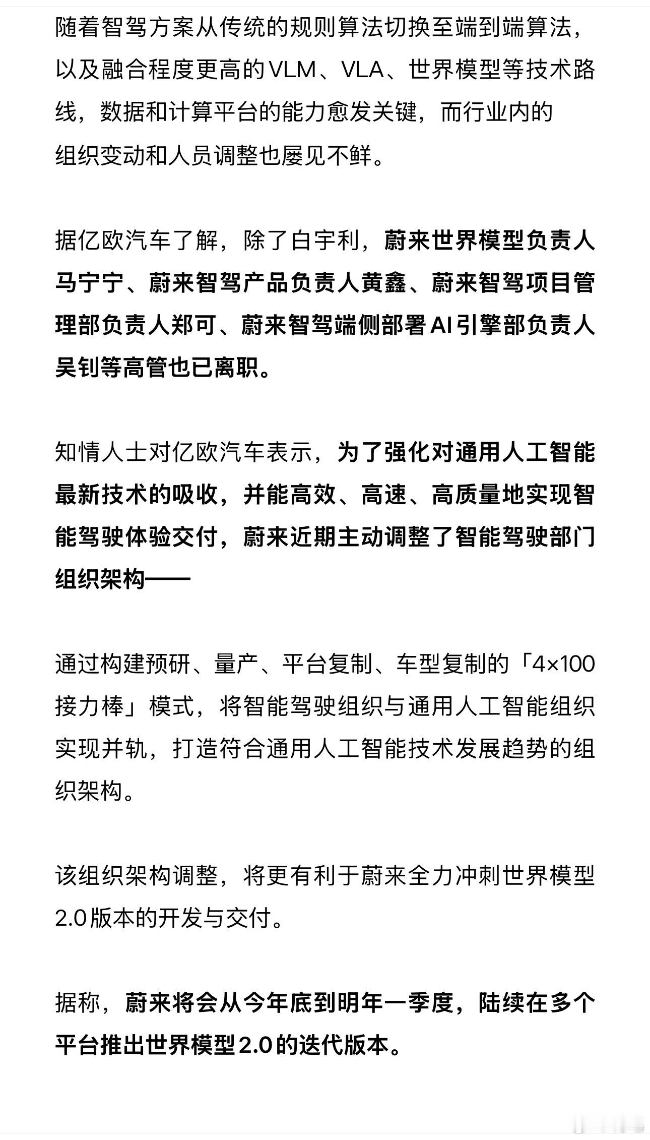 蔚来智驾部门最近好几位核心高管都离职了,包括人工智能平台负责人白宇利、蔚来世界模型负责人马宁宁、蔚来智驾产品负责人黄鑫、蔚来智驾项目管理部负责人郑可、蔚来智驾端侧部署AI引擎部负责人吴钊等。