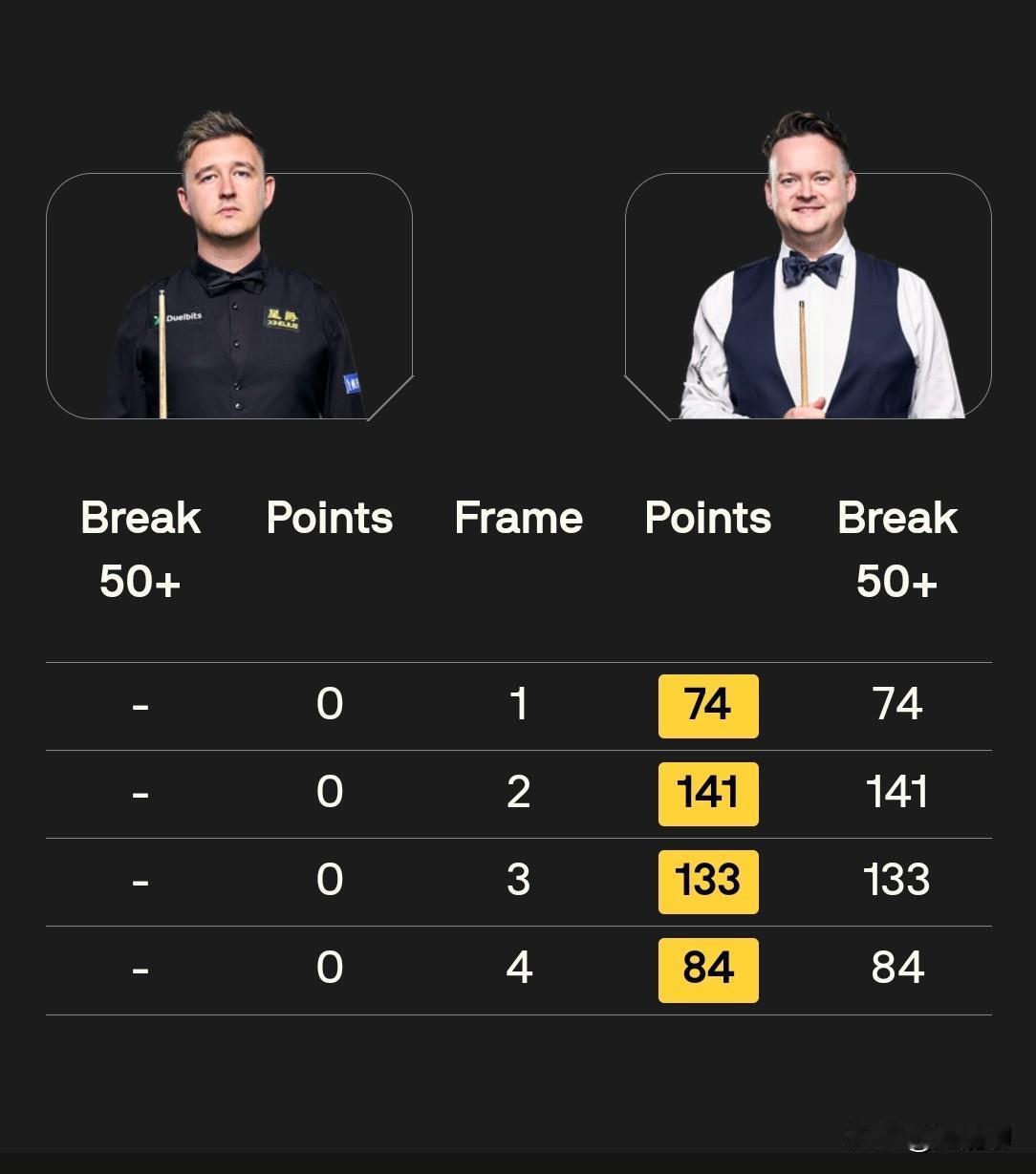 墨菲上半场直接给囧哥打郁闷了,4连鞭连拿了432分,囧哥一分都没捞着。下半场如果
