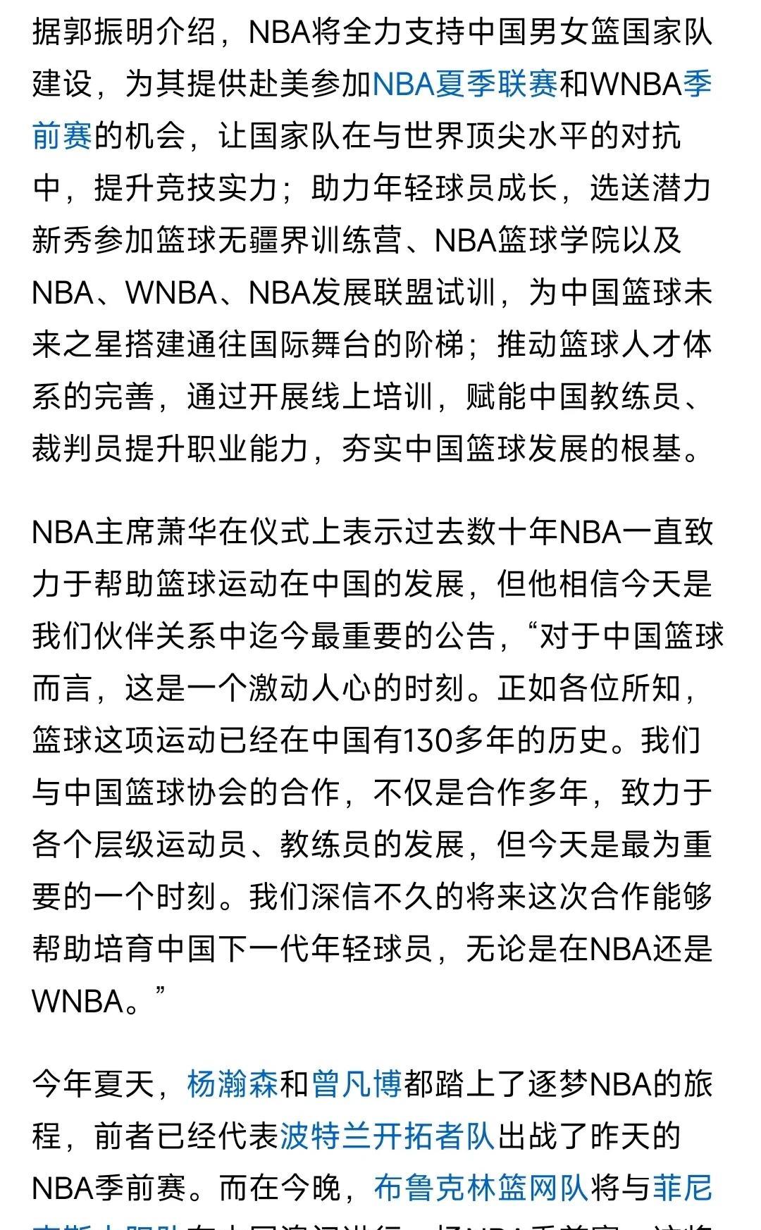 历史性深度合作!CBA要多与NBA接轨! 近日,NBA中国赛花落澳门,吸引了无数的球迷和NBA球星,NBA中国赛拉进了中国球员与NBA的距离,这次篮协主席郭振明和NBA主席肖华达成合作!对于中国篮球的发展有极大的帮助! 合作内容包括NBA发展联盟、夏季联赛、NBA中国赛季前赛等等以后中国赛和夏季联赛的中国球员肯定会越来越多,帮助中国篮球走出低谷,慢慢发展和打磨技术!