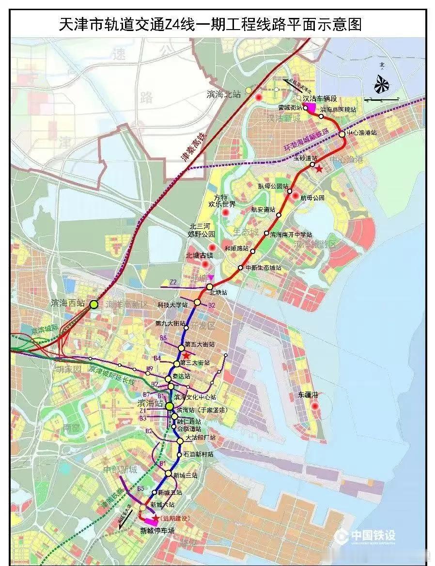 天津市轨道交通Z4线一期工程(北段)项目全长43.7km,全线共设车站24座,最高运行速度120km/h,项目覆盖汉沽老城区、中新天津生态城、滨海—中关村科技园、天津经开区东区、天碱片区、于家堡、中部新城等客流集散点,是天津市“十四五”规划重点工程、2025年二十项民心工程之一,也是滨海新区“十大工程”之一。