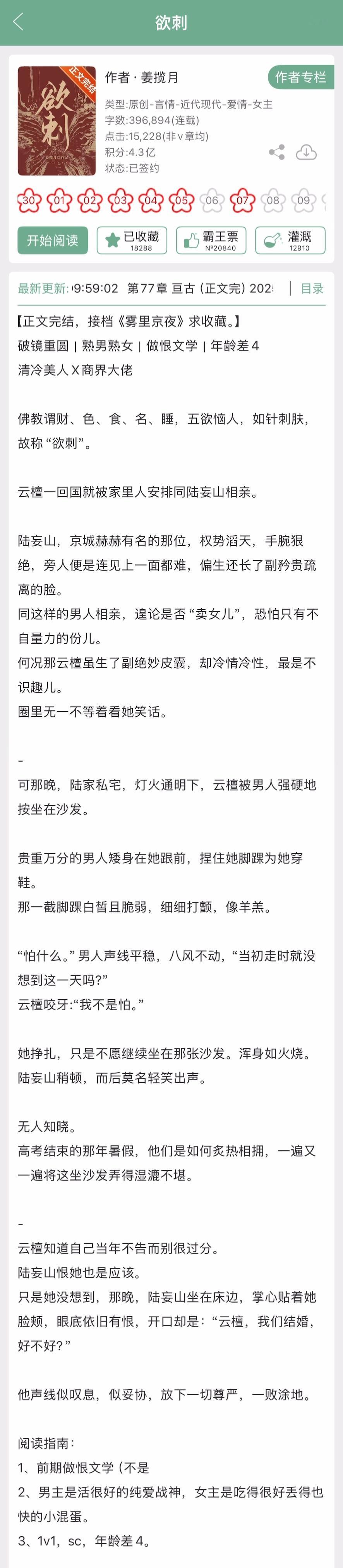 姜揽月的《欲刺》完结啦!现言,做恨文学➕破镜重圆➕熟男熟女,清冷美人x商界大佬[开学季]