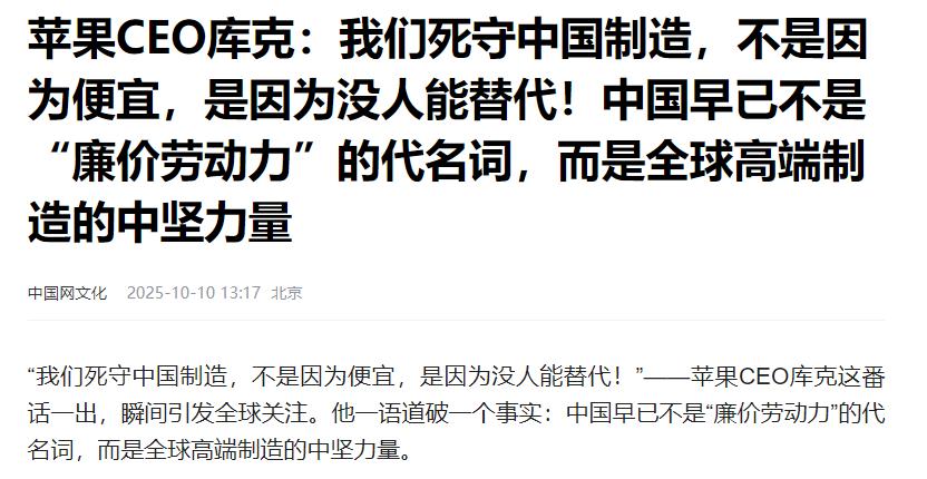 苹果CEO库克抛出惊人言论,振聋发聩!他说:“我们死守中国制造,不是因为中国工厂‘廉价’,是因为没人能替代!在美国凑不齐的精密制造工程师,中国一个省能填满几个足球场!” 很多人过去总觉得,苹果把工厂放中国,就是看中劳动力便宜。但库克的话直接点破,“现在早不是拼人力成本的时代了”,把外界对“中国制造”的刻板印象彻底打破了。 就拿iPhone的生产来说,手机壳上的铝合金中框,需要精度达到头发丝1/50的CNC加工技术。这种精细活,可不是普通流水线工人能搞定的。它得靠一大批懂技术、会操作精密设备的工程师才行。 在美国,你想找几十位能调试这种设备的师傅,得翻遍大半个国家;可在中国,光是广东、江苏这些制造业大省,随便一个产业集群里就藏着成千上万这样的工程师。这种工程师“扎堆”的底气,背后是中国制造业几十年攒下的家底。 更关键的是,中国有全球最全的电子产业链。从手机里的一颗小芯片,到屏幕、电池、摄像头,90%以上的零部件都能在“一小时产业圈”里配齐。 比如深圳到东莞的产业带里,上午工厂下单要一批OLED屏幕,下午京东方的货就能送上门;德赛电池的生产线,甚至能根据苹果的研发进度同步调整产品规格。 但想把生产线搬回美国,哪有那么容易?这些年美国一直喊“制造业回流”,可现实却很尴尬。 据《经济学人》统计,美国工厂因为缺技术工人,很多生产线只能开一半产能。有美国老板吐槽:“我们想招几个会操作五轴加工机床的技工,招聘启事挂了三个月,就来了两个面试的,还都没实际经验。” 就算政府给补贴,没人干活也白搭,苹果要是真把核心生产线迁回去,恐怕连新机按时上市都难。 印度虽然也在接苹果的订单,鸿海还在印度投了十几亿美元建工厂,计划年产几千万部iPhone。但实际情况是,印度的零部件大多还得从中国运过去,本土化率刚过三成。 而且工人的熟练程度差得远,有代工厂负责人透露,印度工人组装一部iPhone,比中国工人多花20分钟,还容易出现外壳划伤、按键松动的问题,良品率比中国工厂低15%以上。所以直到现在,iPhone最复杂的Pro系列,首发量产还是只能靠中国工厂。 库克的话,其实也是在认可中国制造的升级,现在的中国制造早就不是靠低价竞争了。 就像做电池的欣旺达,他们搞的智能生产线用AI控制,生产速度比传统线快四成,精度能到纳米级;还有华为供应链上的企业,很多都有自己的专利技术,能跟着客户一起研发新产品。这种从“制造”到“智造”的转变,才是中国工厂不可替代的核心。 当然,中国制造业也有要突破的瓶颈,比如高端光刻机这些“卡脖子”技术还得加油。但不可否认的是,庞大的工程师队伍、完整的产业链配套,还有快速响应的制造能力,已经让中国成为全球制造业的“稳定器”。 库克的这番大实话,不过是把这个事实摆到了台面上——中国制造的底气,从来不是便宜,而是实力。