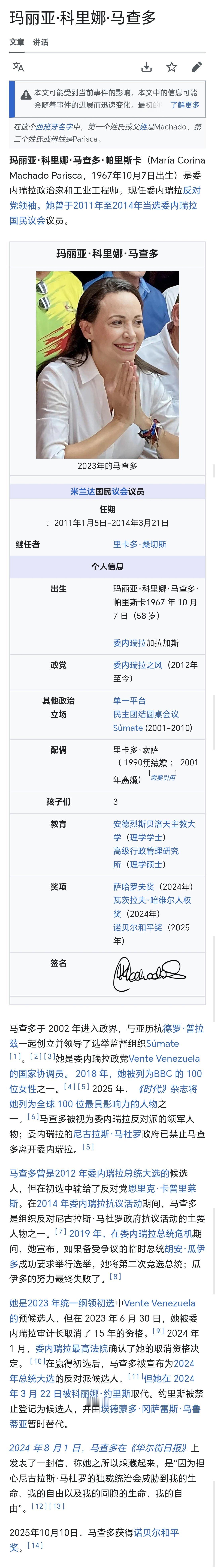 2025年诺贝尔和平奖公布诺贝尔和平奖获得者,委内瑞拉反对派玛丽亚·科里娜·马查多的简历
