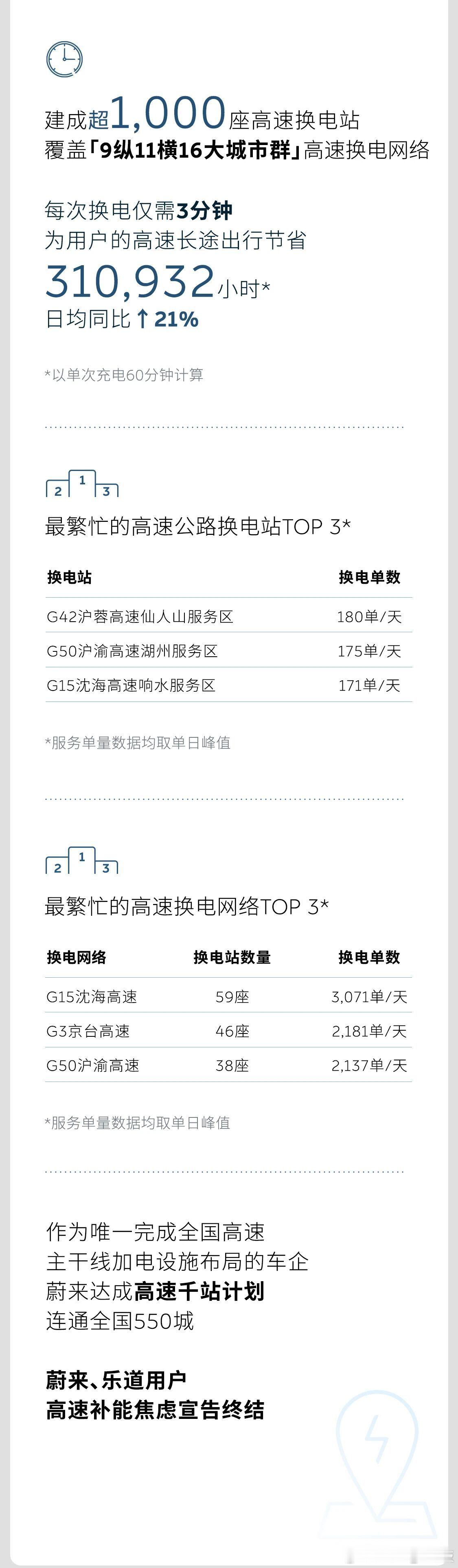 “9纵11横”的高速换电网早连起来了,1000多座站覆盖550个城,像G15、G3这些常走的高速,一天换电都超2000单,随到随换很省心。
