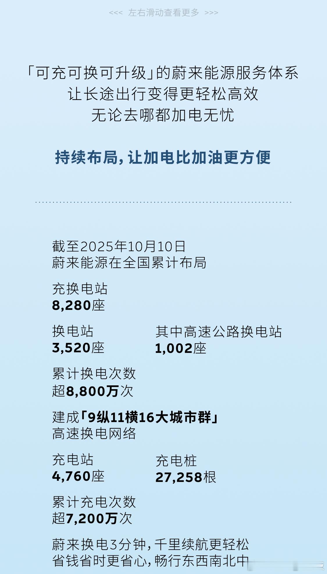十一假期跑长途,补能全程用蔚来换电,3分钟满电就出发,真的香。蔚来官方发发布了十一加电报告: