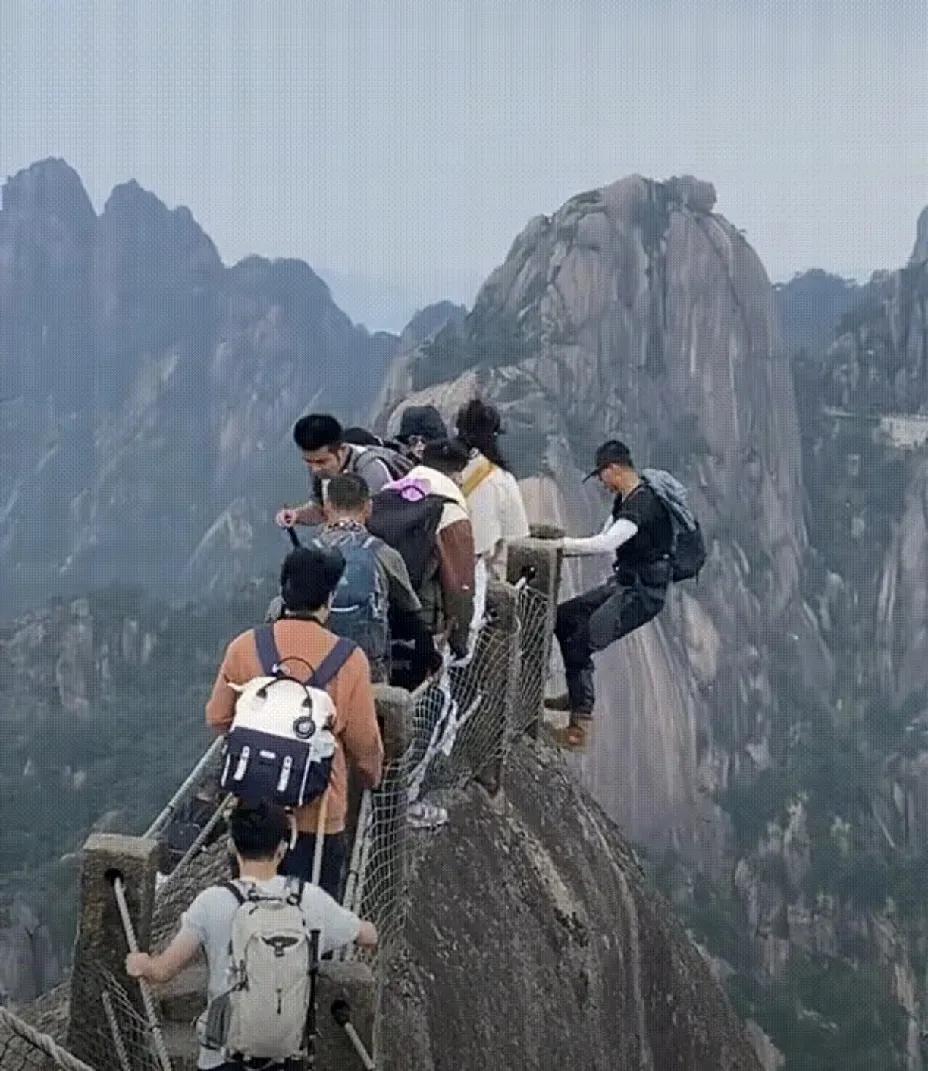 这种人真是不怕死! 那么陡峭的地方,还徒手攀栏杆,一旦失手,就是跌入百丈悬崖,看