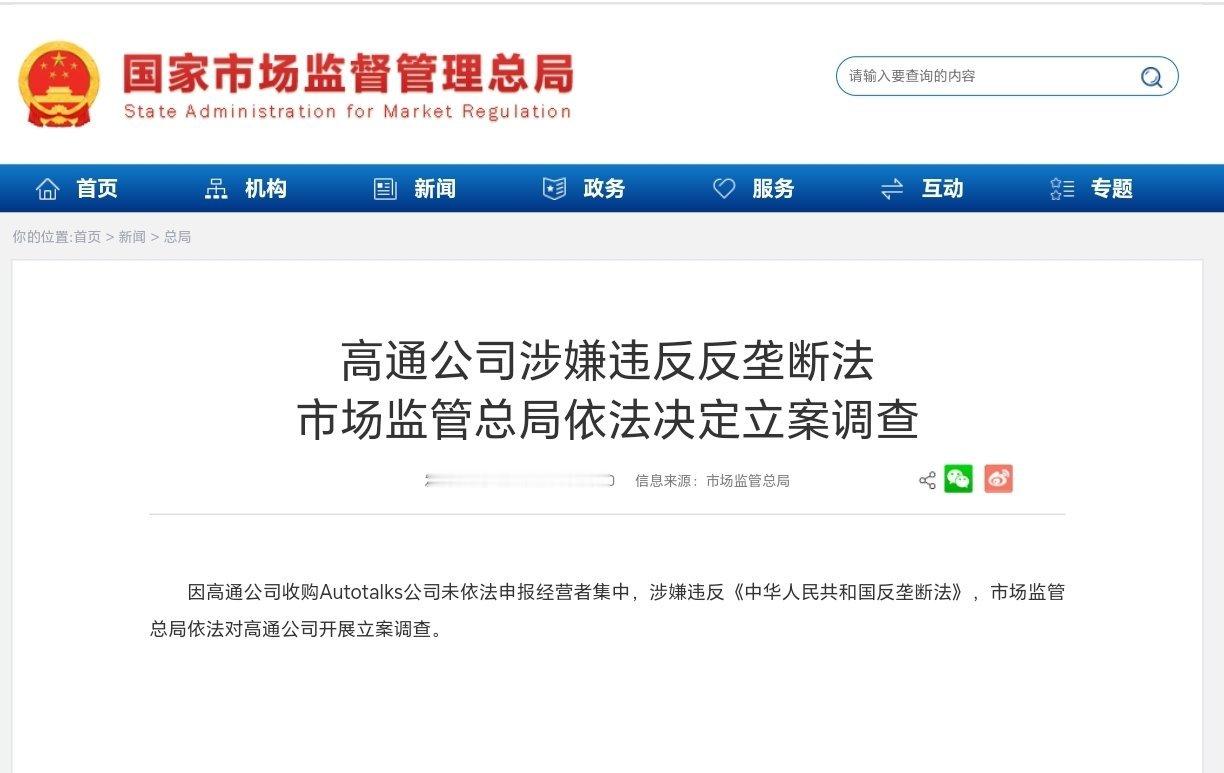 因高通公司收购Autotalks公司未依法申报经营者集中,涉嫌违反《中华人民共和国反垄断法》,市场监管总局依法对高通公司开展立案调查。