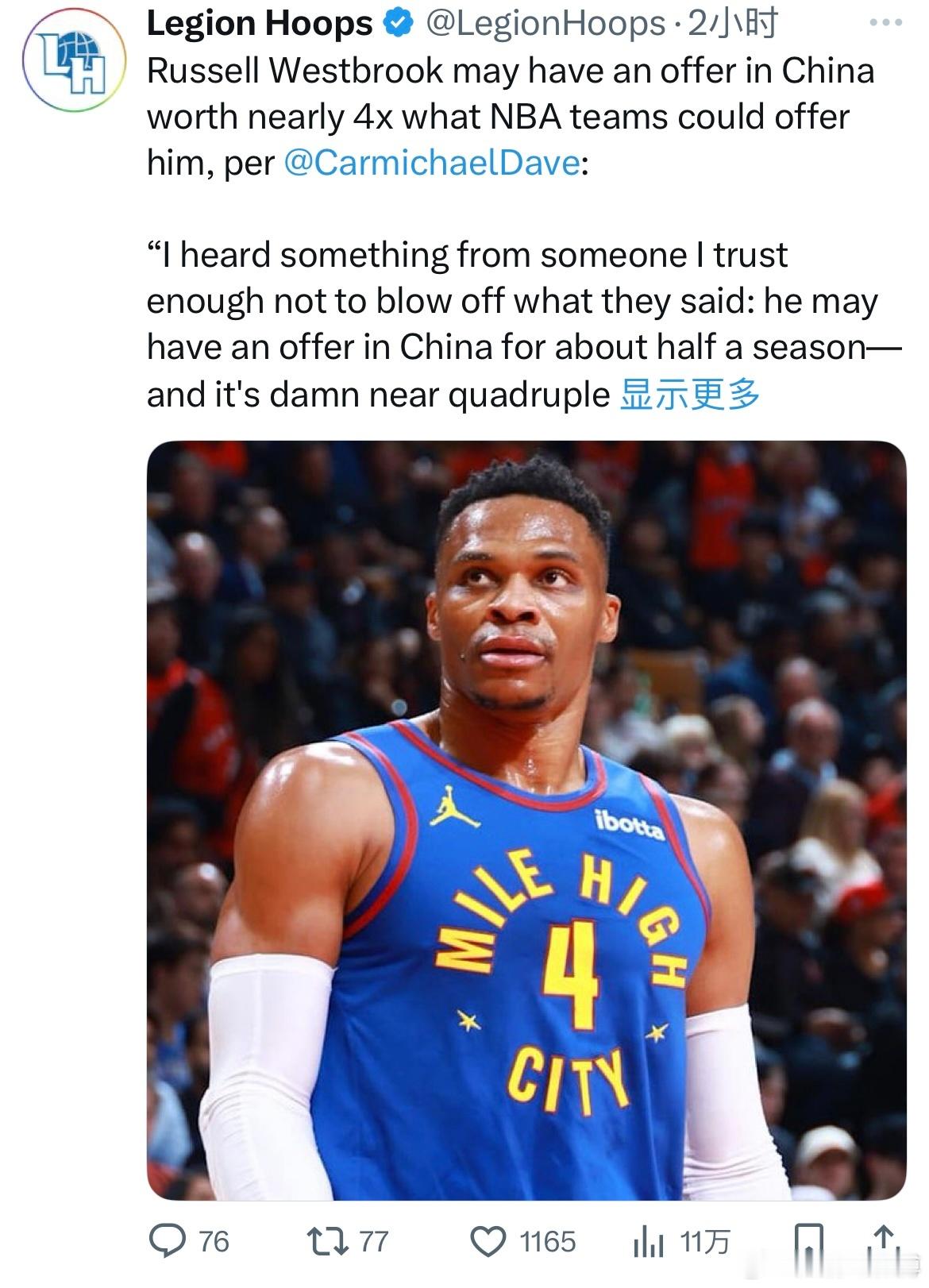 威斯布鲁克可能在中国收到一份价值几乎是NBA球队能提供给他的四倍的报价🚀