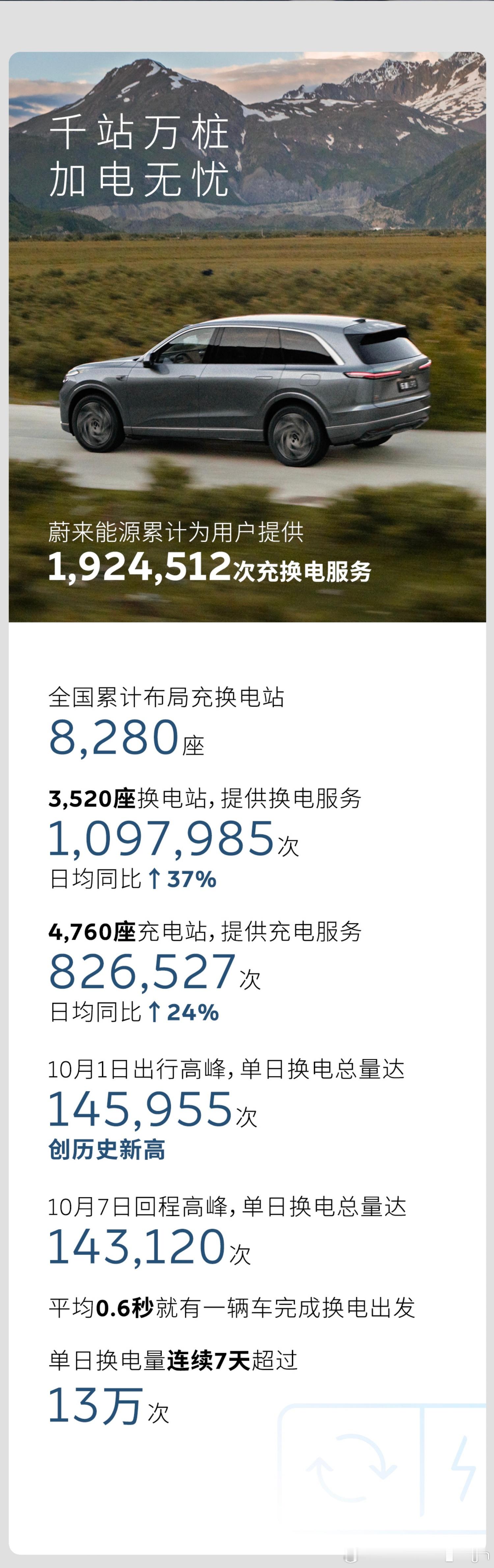蔚来的国庆长假补能报告信息量很大。[并不简单]✅单日换电量连续7天超过13万次