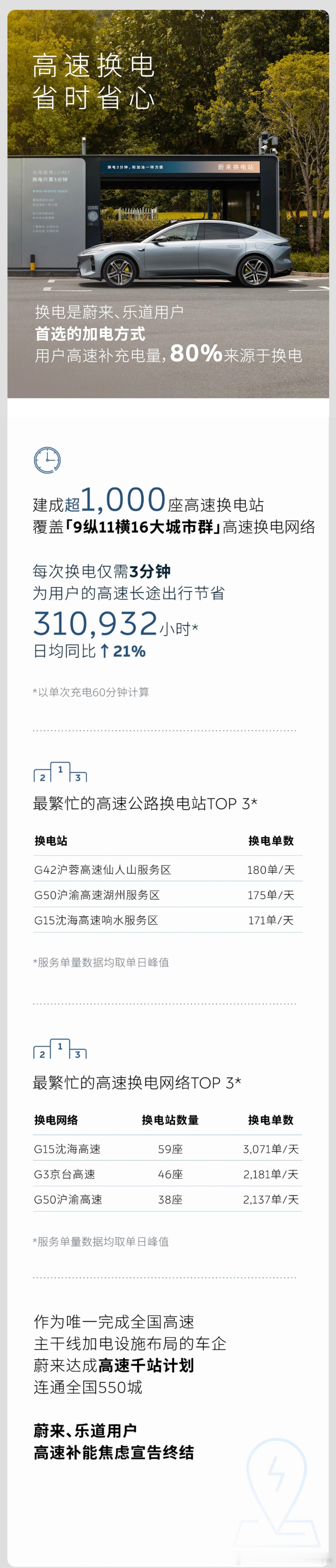 ✅ 换电是蔚来、乐道用户首选的加电方式,他们在高速补充的电量,有80%来源于换电,换电让用户可以更简单地去到诗和远方。