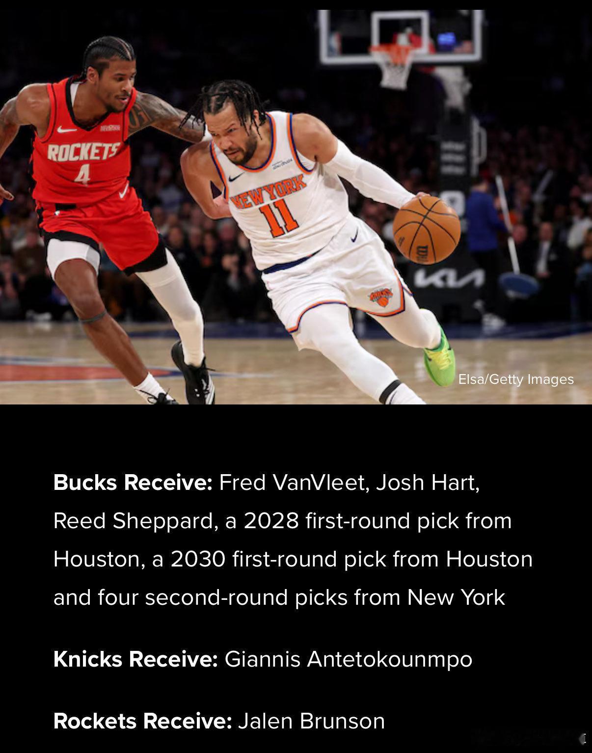 雄鹿得到:范弗利特+谢泼德+火箭28年首轮秀+火箭30年首轮秀+哈特+4个尼克斯的二轮秀