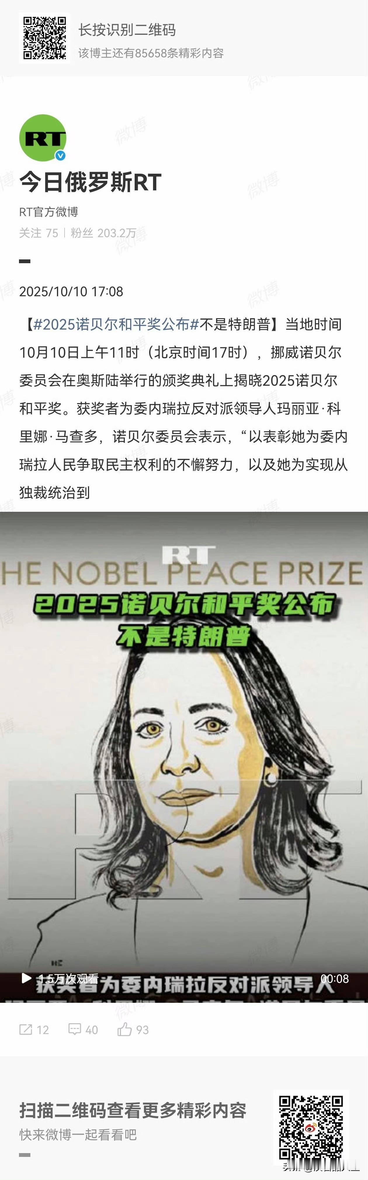 2025年诺贝尔和平奖得主出来了,既不是叫嚷的最欢的特总,也不是传说中的格雷塔,而是委内瑞拉反对派领导人玛利亚·科里娜·马查多。诺委会的获奖词里出现了那些我们熟悉的字眼,比如为委内瑞拉人民争取民主权利等等。不知道特总会不会很失望,结果不过有一次印证了艾教授说的很对。