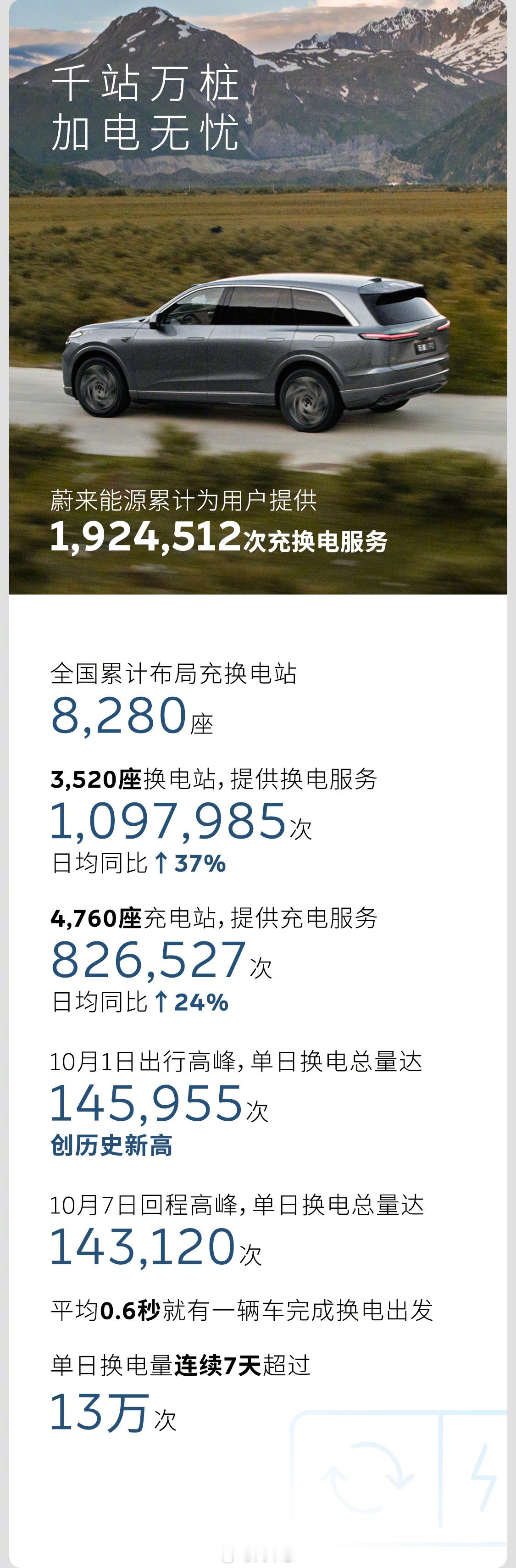 一直换电一直爽,蔚来国庆加电报告来了,十一假期换电单量达109.8万单再创新高[哆啦A梦吃惊][哆啦A梦吃惊]