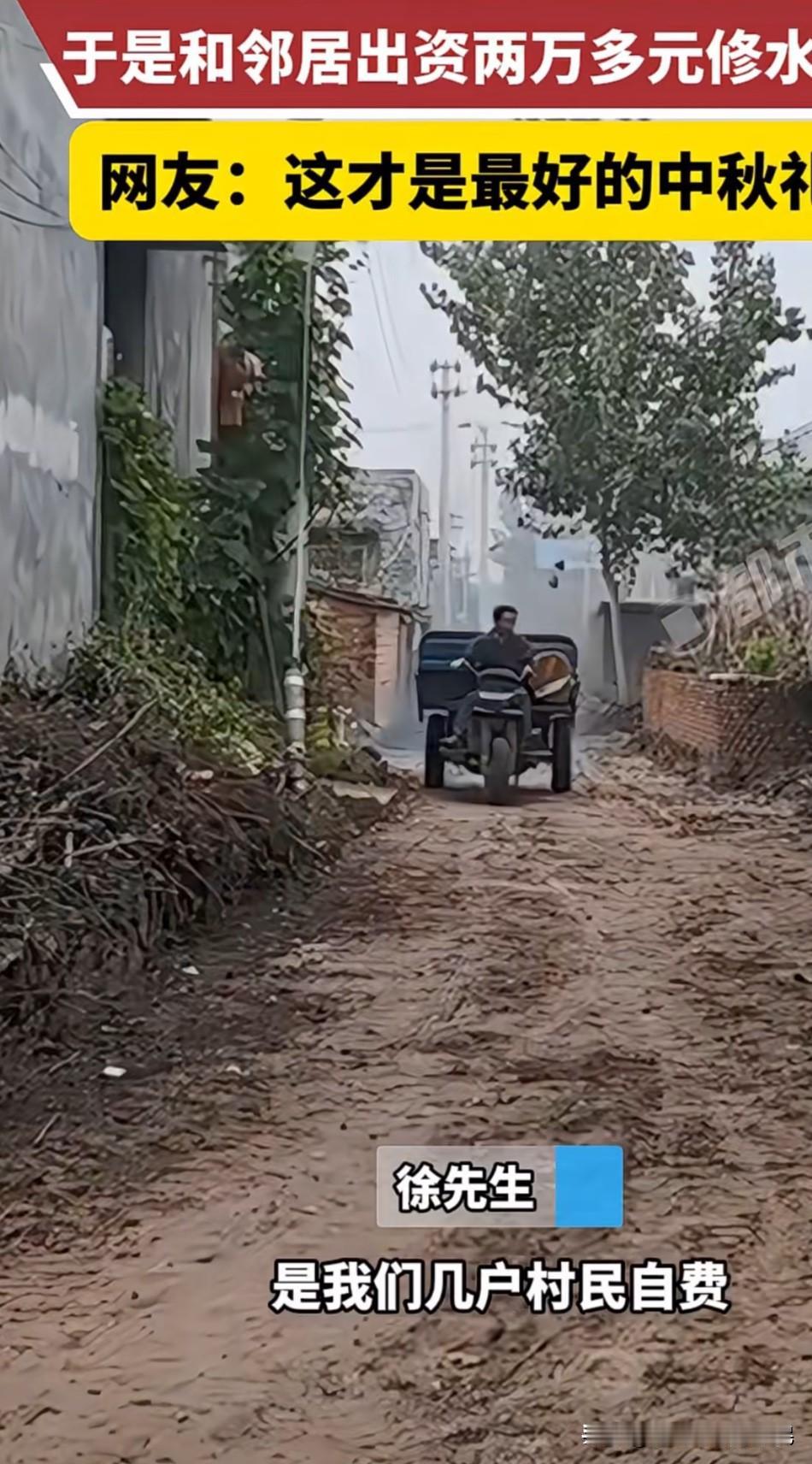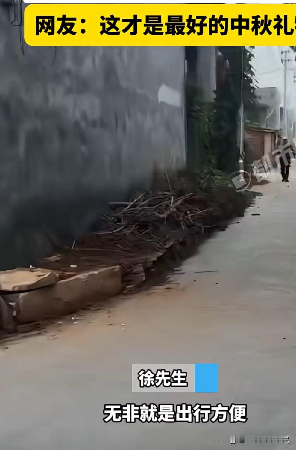 超强的执行力 老家的路是土路,一下雨下雪的就会非常的难走,很泥泞,徐先生虽然定居在地,但是老家毕竟在那里,逢年过节总会回老家的,就想着把路修一修。 跟路边的四邻商议后,决定大家共同出资2万元。农历八月十四晚上决定修路,八月十五晚上就开始铺水泥,八月十八日铺就铺好,路很平整,出行很方便。 他们做的这件事是中秋节最好的礼物! 修桥铺路这是积德行善。
