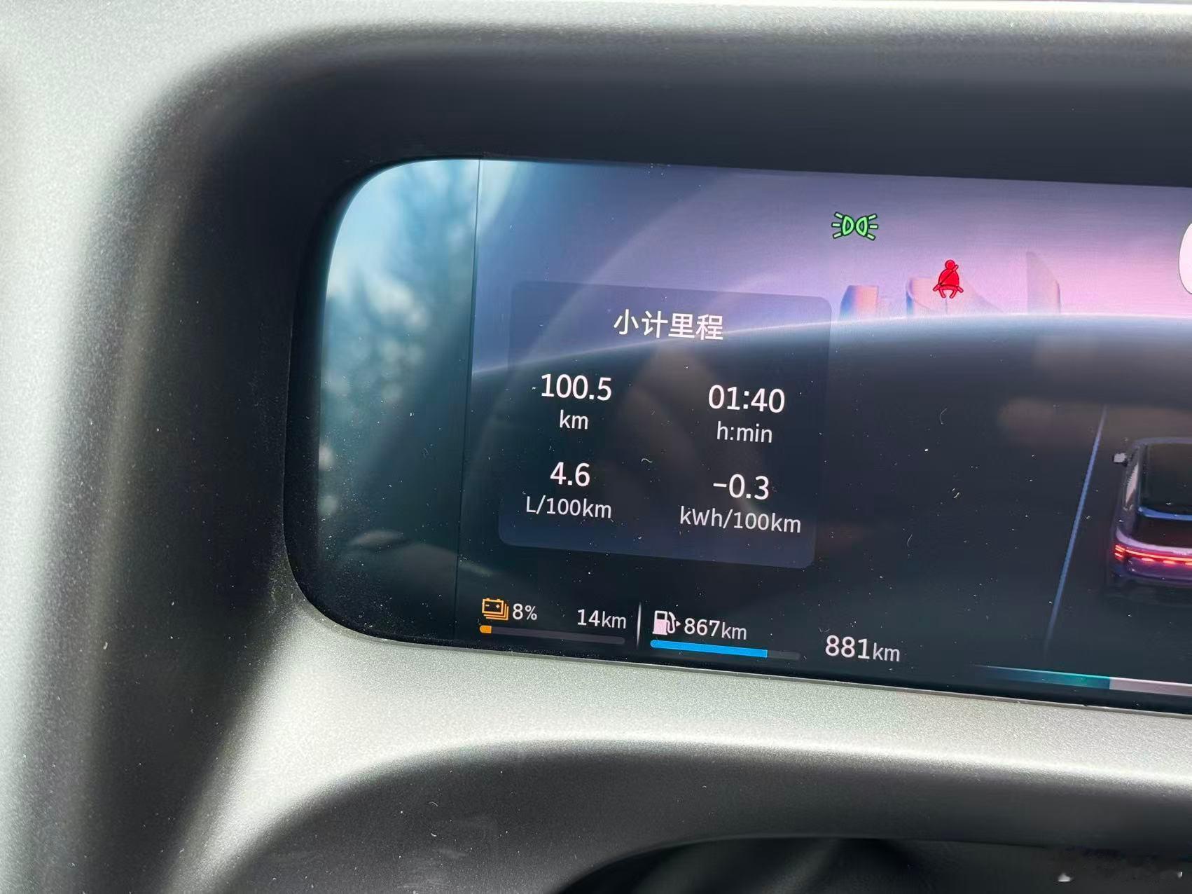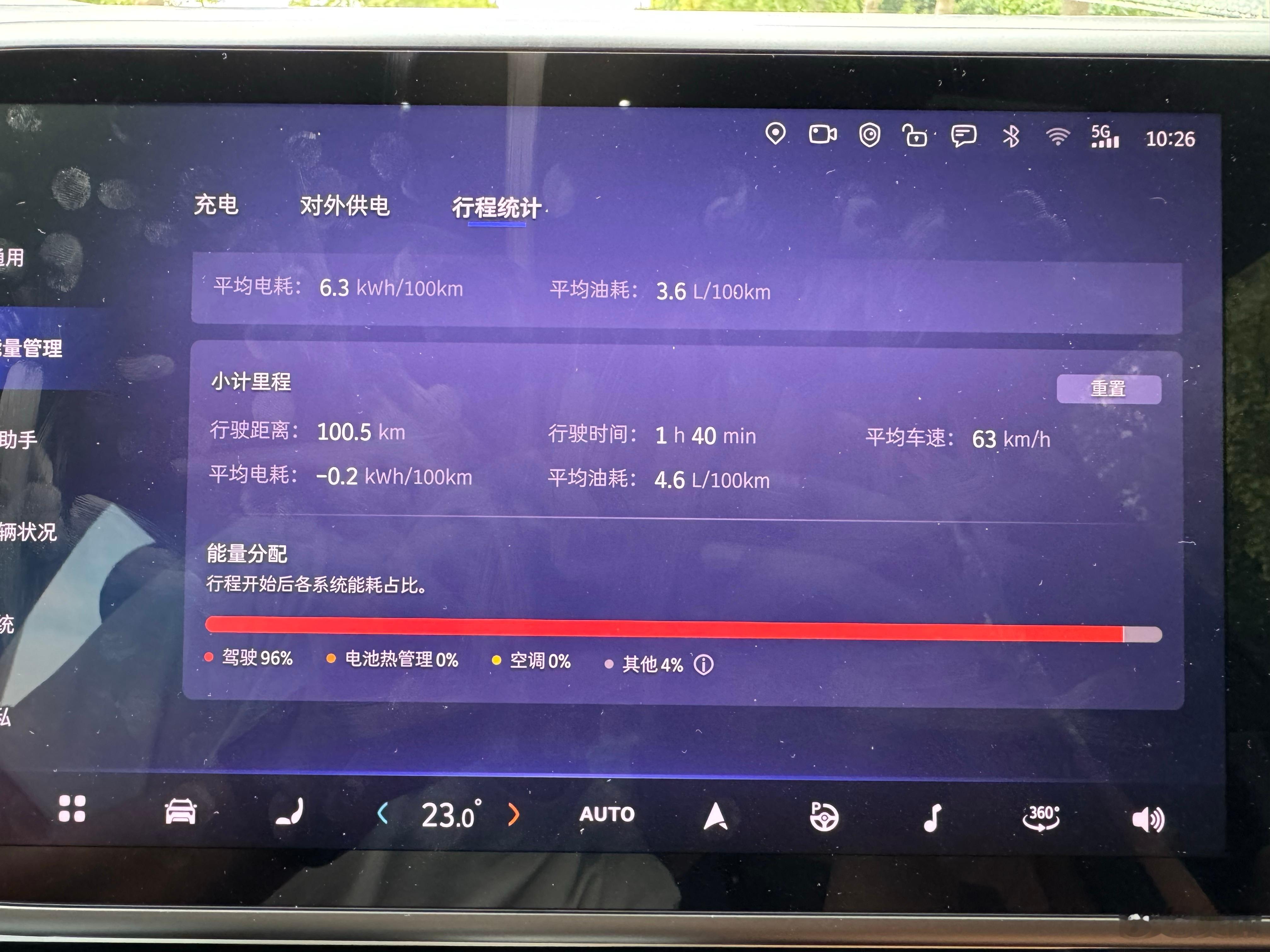 亏电油耗也帮大家简单测了下。测试当天室外温度在28摄氏度左右,车内空调设定23度、自动,用的智能电混模式,全程就高速出行,北京北三环出发行驶京承高速至雁栖湖,再折返走京承高速回到顺义公司,高速路上有一些拥堵,平均时速63km/h,行驶完100公里得到的真实亏电油耗4.6L/百公里,成绩不错。同时大家可以看到仪表数据平均电耗是负数,也就意味着,发动机还反向给电池充了一点电,实际百公里燃油消耗应该会更低。