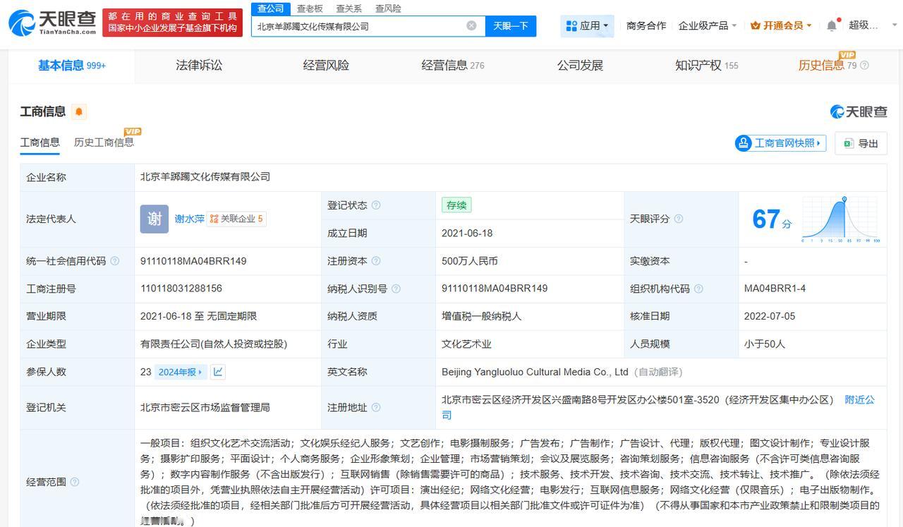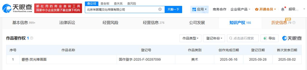 易烊千玺公司登记礐嶨作品著作权 羊踯躅公司登记礐嶨作品著作权 天眼查App显示,