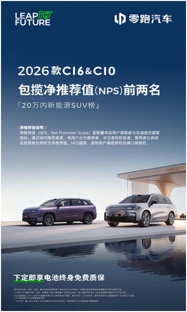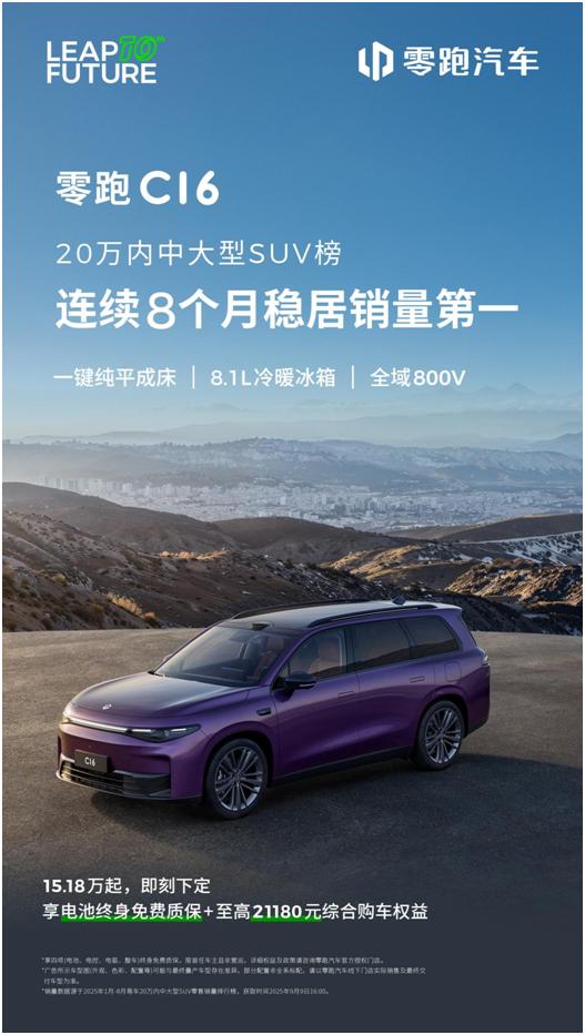 20万以内大六座SUV,零跑C16为何是首选? 20万以内买大六座SUV,大家会关注哪些因素呢?续航、舒适等是绕不开的因素,在这些层面能做到全能的车型自然会赢得大家的认可,就比如零跑C16,已经连续8个月稳居20万内中大型SUV的销量冠军,并且还与自家的零跑C10包揽20万以内新能源SUV榜净推荐值(NPS)前两名。 能够做到销量和净推荐值双领跑,说明零跑C16是大六座SUV的首选。无论是大家选择纯电续航280km的增程版,还是续航630km的纯电版,零跑C16都能带给大家无焦虑的自由出行体验。 而在舒适层面,零跑C16配备有方向盘加热,车载冰箱,后排小桌板,前排和第二排隔音玻璃,前排+二排座椅加热、通风和按摩功能的Nappa皮质座椅,以及第二排座椅前后左右四向移动,进出第三排更方便,全家人出行每个人都能实现舒适平权。 另外,高通8295芯片+通义千问+DeepSeek双AI大模型,以及15.6英寸高清吸顶屏的配备,能带来更有乐趣的出行体验。而8650芯片+激光雷达+组合辅助驾驶系统,不仅支持高速领航辅助、城区领航辅助、自动泊车以及记忆泊车功能,还能实现AR实景导航以及高清地图。 如此越级满配的体验,C16可谓是独一档了!再加上零跑现在品牌影响力也越来越强,国庆销量都暴涨62%了,信任零跑的消费者越来越多,所以20万以内的大六座SUV,首选零跑C16准没错!