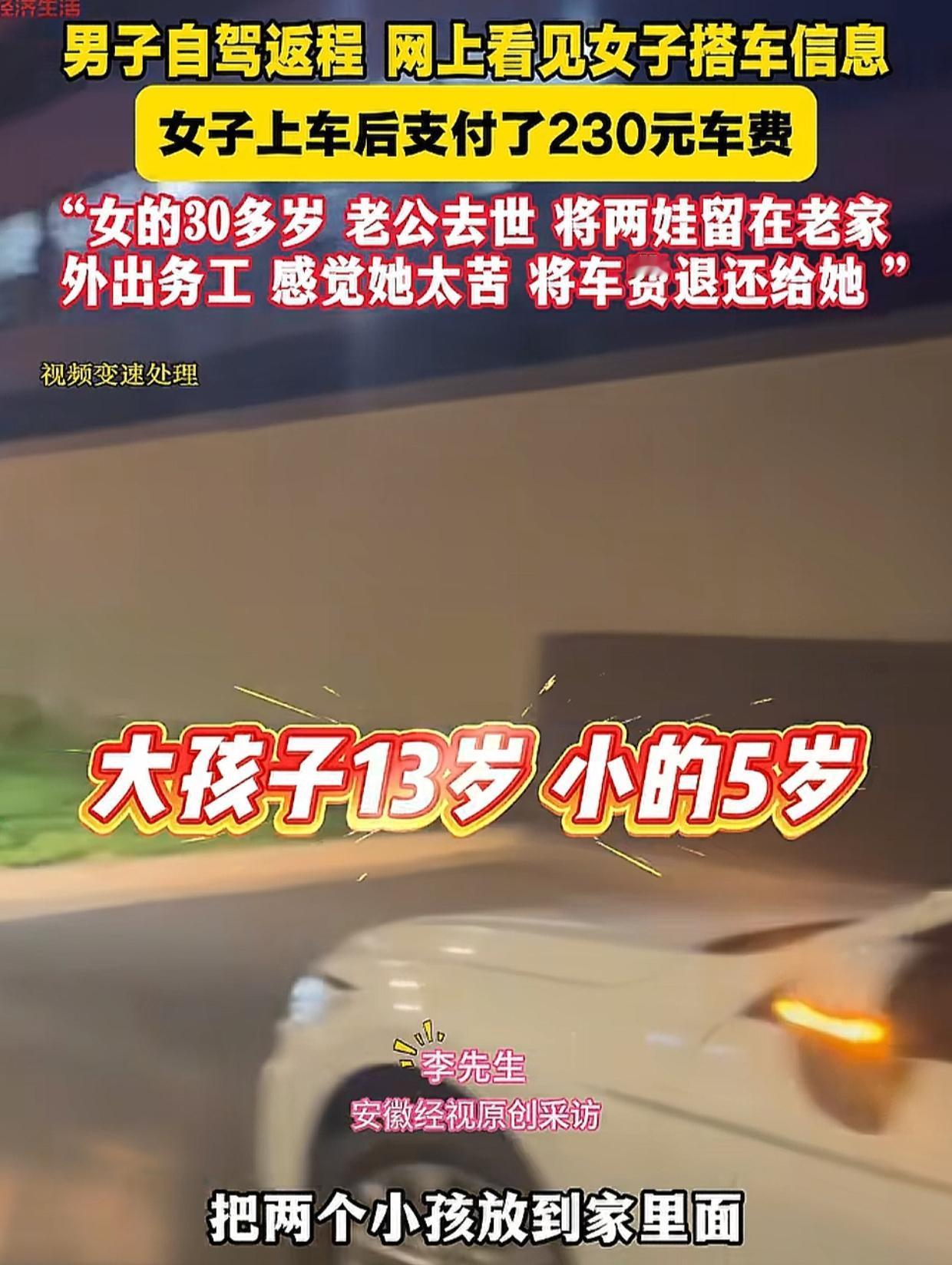 河南民权,男子自驾回宁波,联系了一个30多岁的女子搭车。闲谈中得知女子的丈夫去世,她为了抚养一个13岁和一个5岁的孩子独自在外打工,男子一阵心酸,直接把230元车费退给了她。 假期结束,男子要和两位兄弟一起从河南老家回宁波,为了挣点儿油费,就在网上联系了一位想要搭车的女子,说好费用是230元。 女子30多岁,路上闲谈时,男子得知女子的丈夫去年去世,她为了抚养一个13岁和一个5岁的孩子独自在外打工,心里不免感到一阵心酸。 这时候女子的孩子从老家给她打来视频,诉说思念之情,女子心疼和惦念孩子,为了生计又不得不出门奔波,在电话这头哭得泣不成声。 男子觉得女子活得太苦了,同情她的不容易,想帮她一把,就把230元车费退给了她,之后又一直将她送到了她打工的工厂里面。 男子表示,她作为一个女人太不容易了,我怎么会要她的钱,我们三兄弟就当做回好人,希望她的日子越来越好。 男子的话简单朴素,却充满着人性的温暖。 这世上善良的人很多,很多人都能被别人的不容易触碰内心的柔软,但能将这种同情之心化作助人义举的是真正的君子。 男子一个小小善举,给一位为母则刚,独自面对人生风雨的女子带来了温暖、力量和信念,这就是善良的意义。 善行无价,我们应该向生活中所有这样的与人为善者致敬!