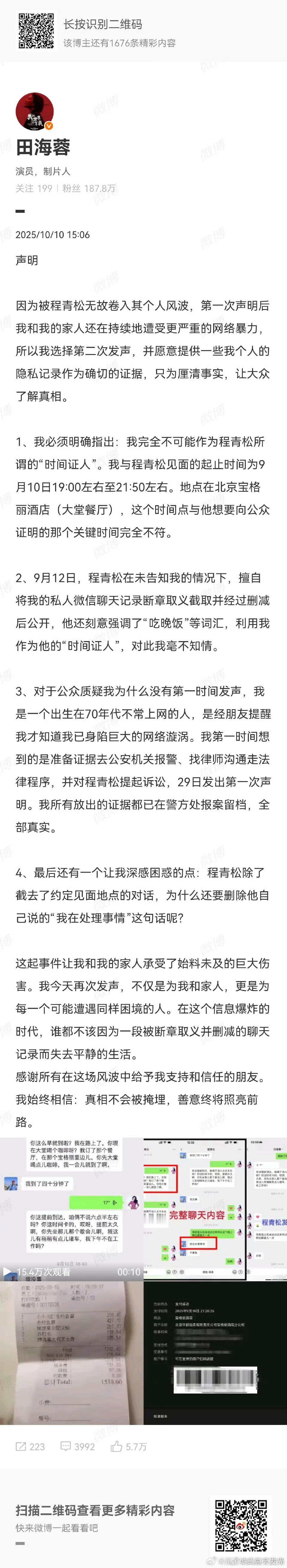 被误会了那么久,田海蓉来为自己澄清了,微博公布了完整时间线的聊天记录以及文字说明,家人和自己被攻击许久,呼吁大家吃瓜还是要理性,不知道还有没有后续田海蓉再发声明