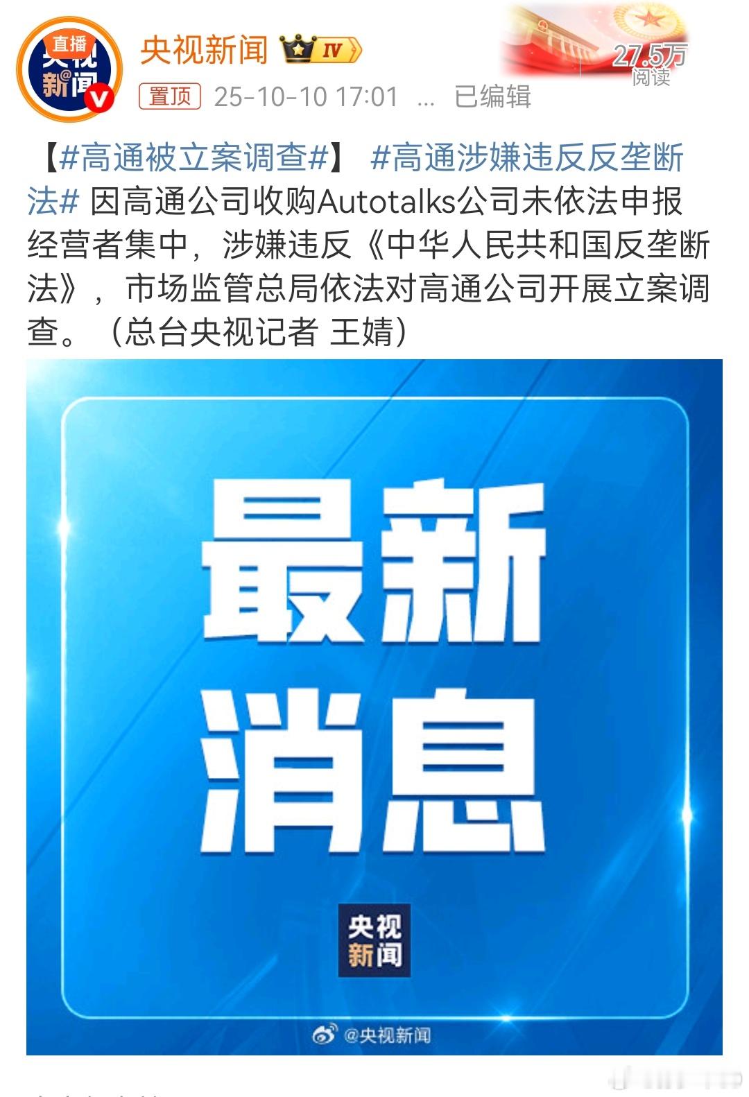 因高通公司收购Autotalks公司未依法申报经营者集中,涉嫌违反《中华人民共和国反垄断法》,市场监管总局依法对高通公司开展立案调查。