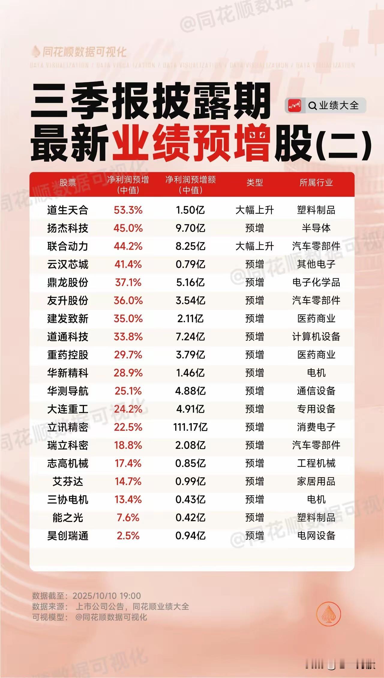 关于“三季报披露期最新业绩预增股”的总结: 截至目前(2025年10月10日19:00),基于上市公司公告及自身业绩大全数据,整理并发布了最新一批三季报业绩预增的股票,分为两部分展示: 【第一部分:业绩大幅上升股(一)】 这部分列出了多家预计净利润同比大幅增长的公司,增幅普遍在100%以上,部分甚至超过1000%。例如: - 英联股份净利润预增中值高达1602.1%,预增额约0.36亿元,属于包装印刷行业,类型标注为“大幅上升”; - 广东明珠预增964.9%,利民股份预增659.5%,北方稀土预增279.9%,兄弟科技预增230.4%,永和股份预增218.4%,广大特材预增213.9%,川金诺预增171.6%,金力永磁预增168.0%,长川科技与震裕科技分别预增138.4%和137.8%,有研新材预增114.0%等; - 其它如山东钢铁、涛涛车业、皖维高新、黔源电力、全志科技、中泰股份、吉宏股份、北摩高科等公司也都有较高的预增幅度,从55%至109.6%不等,覆盖行业包括钢铁、汽车零部件、化工、电子、电力、芯片、军工等。 这些公司业绩预增类型大多被标记为“大幅上升”,显示出较强的盈利增长势头。 【第二部分:业绩预增股(二)】 此部分涵盖更多业绩预增企业,但增幅相对第一部分略低,从2.5%到53.3%不等,其中也不乏一些预增金额较大的公司。例如: - 立讯精密虽然预增幅度为22.5%,但预增金额高达111.17亿元,属于消费电子行业,是本批中预增金额最高的公司; - 联合动力预增44.2%,预增额8.25亿元,属于汽车零部件行业; - 鼎龙股份预增37.1%,预增额5.16亿元,属于电子化学品行业; - 扬杰科技预增45.0%,云汉芯城预增41.4%,友升股份预增36.0%,建发致新预增35.0%,道通科技预增33.8%,重药控股预增29.7%,华新精科预增28.9%,华测导航预增25.1%,大连重工预增24.2%等; - 另外,也有部分公司预增幅度较小,如昊创瑞通仅预增2.5%,预增额0.94亿元,属于电网设备行业。 这部分股票覆盖了半导体、汽车零部件、电子化学品、医药商业、通信设备、专用设备、电机、家居用品、塑料制品、电网设备等多个行业,显示出不同领域均有业绩向好的企业。 【整体情况总结】 - 数据截止时间均为2025年10月10日19:00; - 数据来源为上市公司公告和同花顺业绩大全; - 图片一以“大幅上升”类型为主,多数公司净利润预增幅度超过100%,个别甚至超10倍,集中在包装印刷、钢铁、电子、化工等行业; - 图片二则展示了更多业绩预增企业,包括部分预增幅度虽不高但预增金额巨大的公司(如立讯精密),行业分布更加广泛,如消费电子、半导体、医药、汽车、通信、机械等;