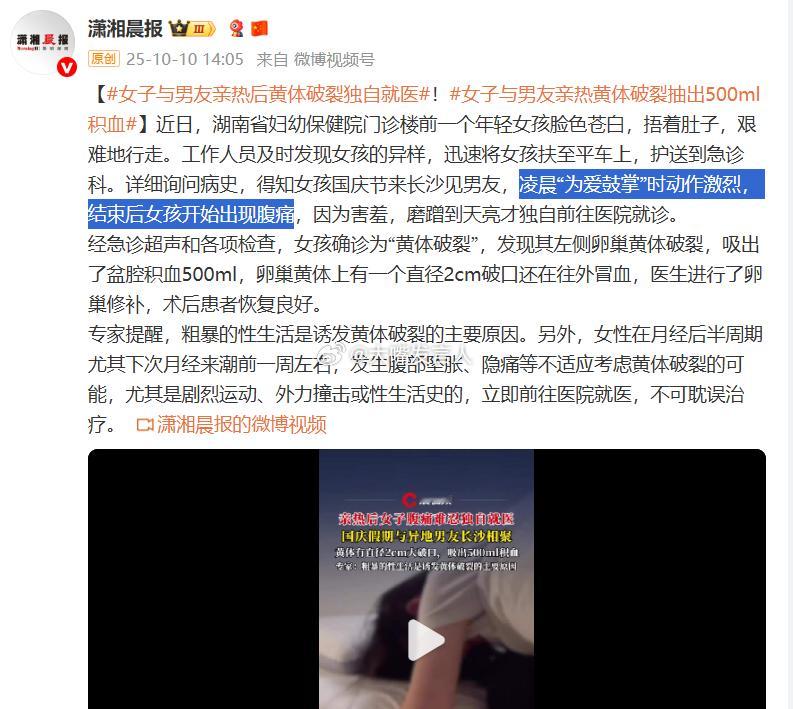 女子与男友亲热黄体破裂抽出500ml积血,热点评论
