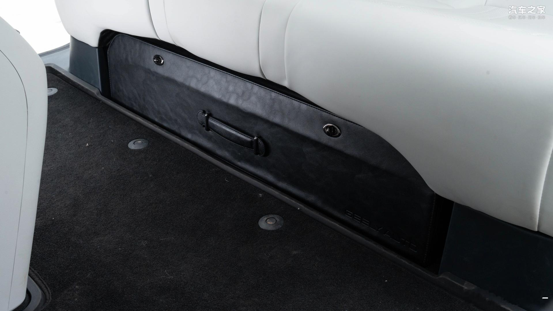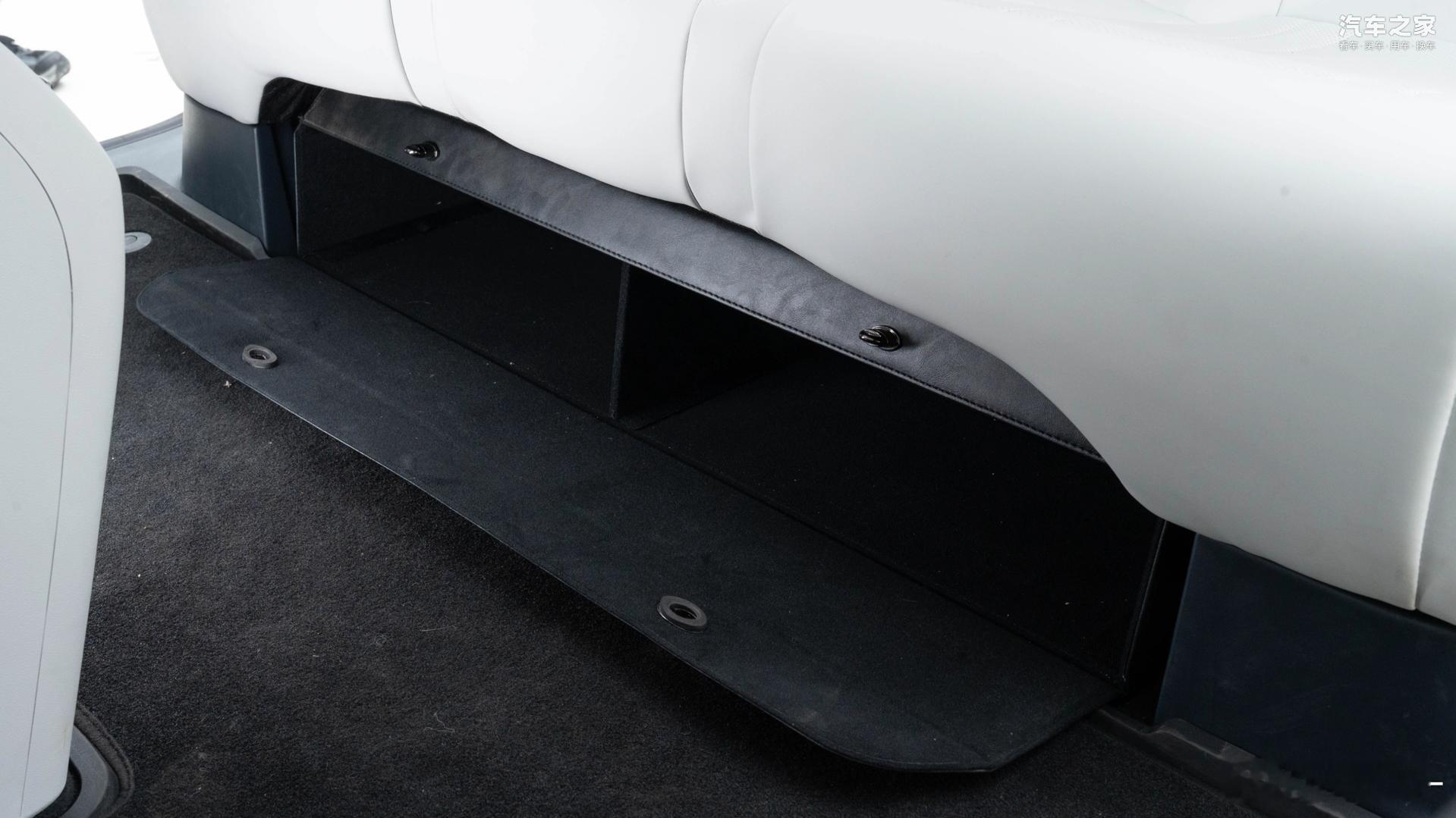 星愿将它们集成到11合一的电驱总成里,第二排座椅底下是空的,星愿做了个可拆卸的储物盒,在银河E5上,这里是个抽屉。