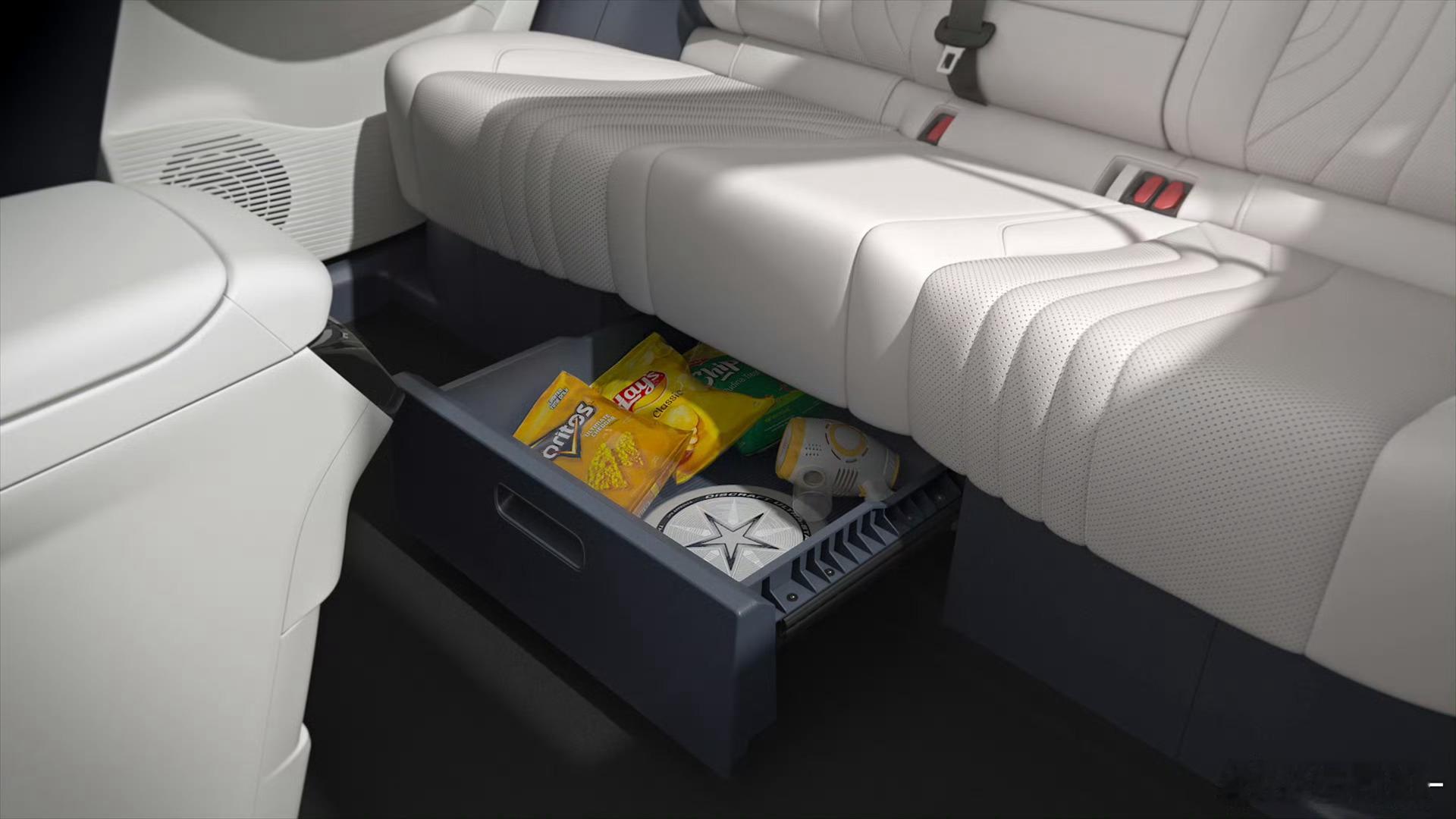 吉利星愿11合一电驱的优势,可被用户感知的部分体现在后排座椅下方的储物盒上。