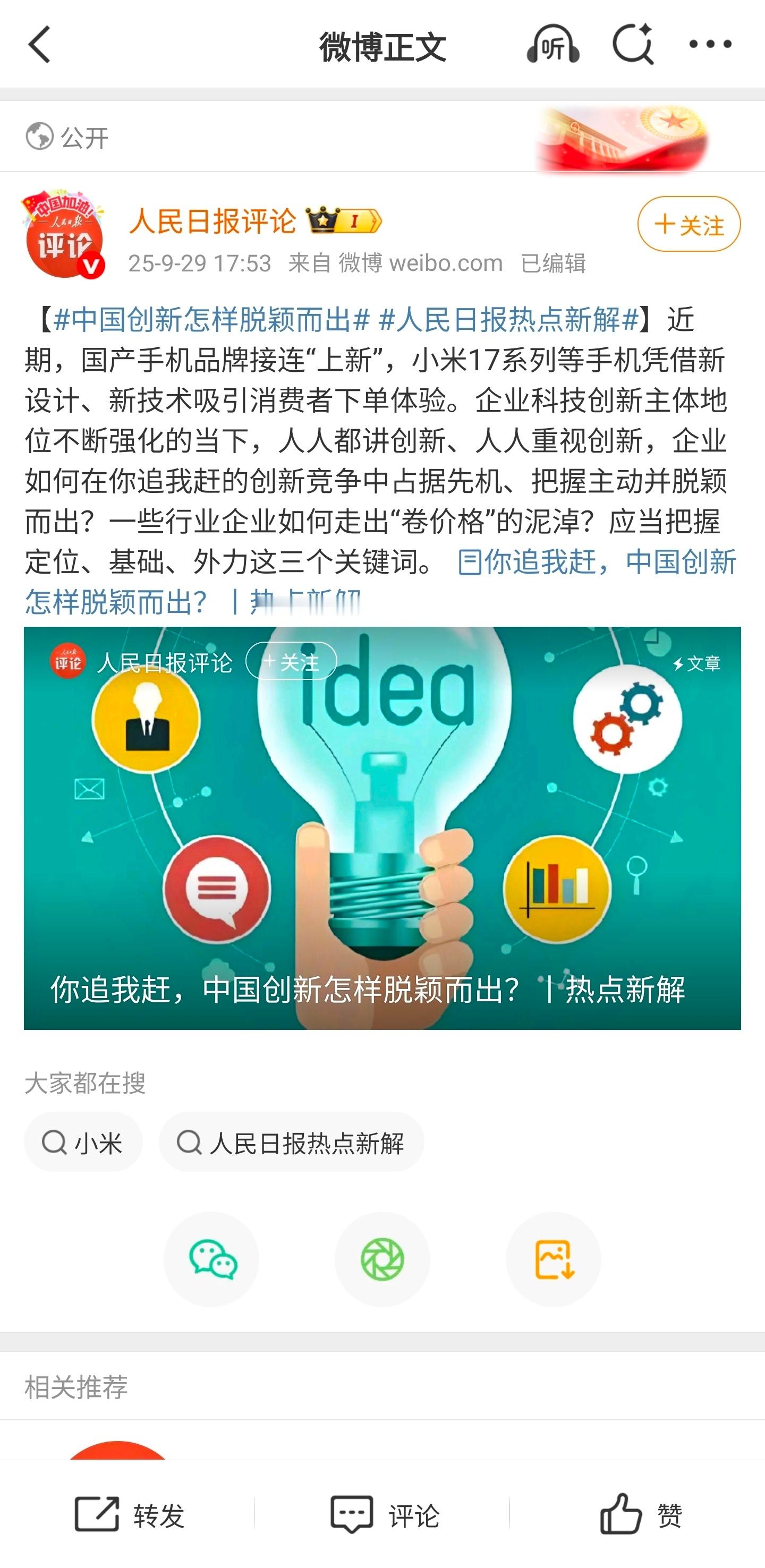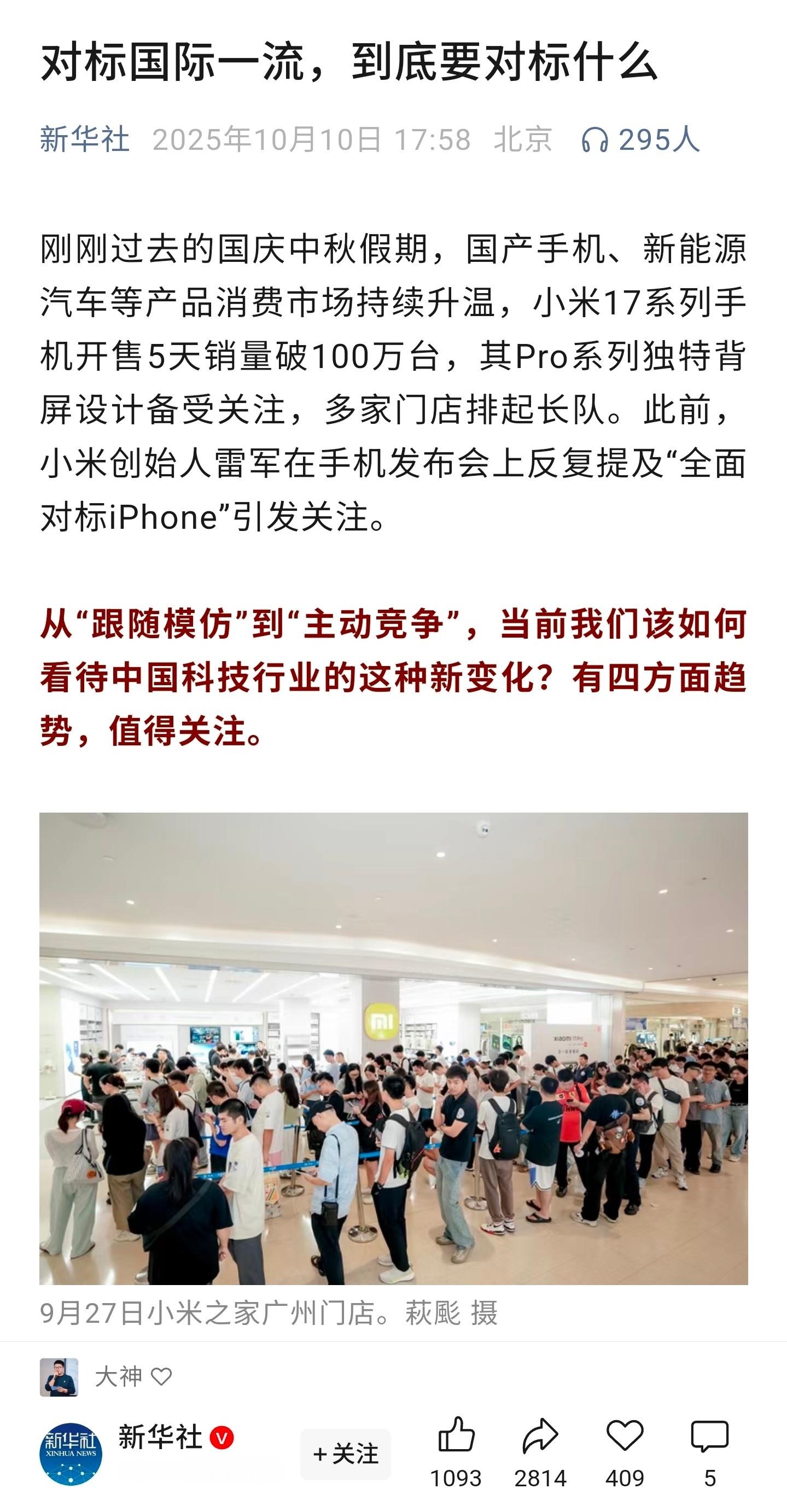 新华社评小米对标苹果 小米17系列首销火到姥姥家了,开售5分钟即刷新国产手机首销纪录,5天销量突破百万,BCI新机激活量占比22.1%,超越苹果(20.2%)荣登榜首!三大央媒齐声点赞,新华社高度评价小米“全面对标iPhone”,彰显中国科技品牌硬核实力。从创新背屏设计惊艳全球,到芯片、汽车等领域的全面突破,小米以持续创新重塑国货形象,赢得国内外广泛认可。过去五年研发投入1000亿元,未来五年计划再投2000亿元,凭借清晰战略与扎实技术积累,小米展现了中国科技从追赶到引领的质变,敢于正面挑战全球巨头,书写国货崛起新篇章!牛!!!