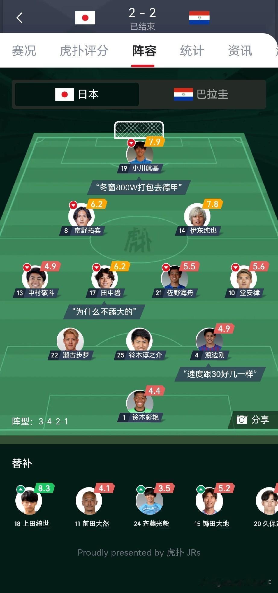 这就是吹牛要拿世界冠军的球队?所谓的亚洲之光就这水平? 这次友谊赛,日本后防线太拉胯了,进攻又便秘。进的两个球都是对手失误,没有绝对的机会,还是有明显差距的。 其实日本就怕这种欧美技术型,反而不怕欧洲的某些球队。 说真的,日本目前就是十六强的水平,如果运气好的话可以进入八强,但最多也就是八强了! 感觉现在的小日本越来越像网红球队了,连世界杯8强都没进过,就敢说世界杯夺冠,我也是醉了,老天爷要是有眼,26年世界杯,日本小组赛就应该立刻杯打出原型被淘汰。