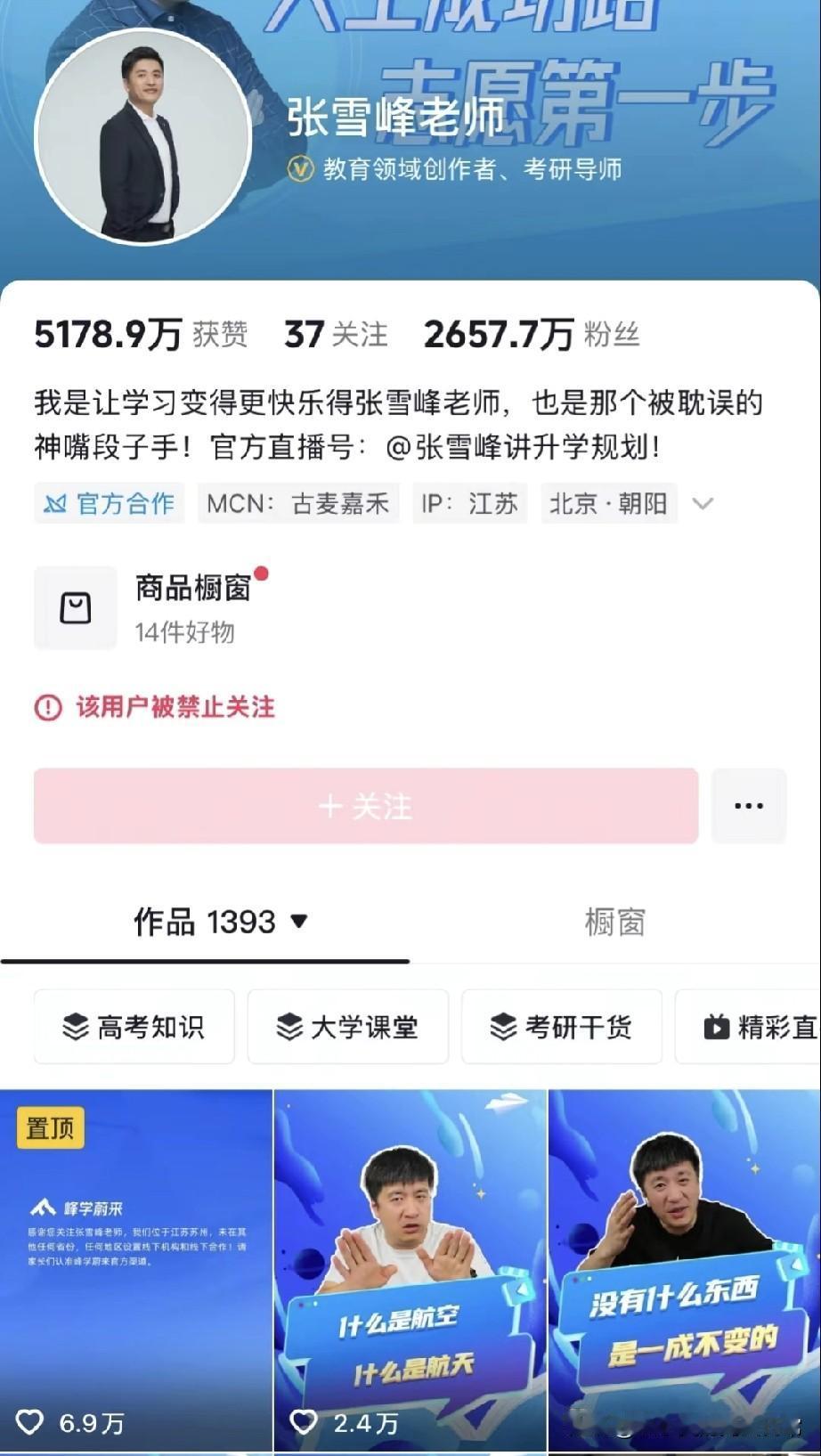 蓝战非解封回归,张雪峰仍被禁,户晨风彻底凉! 吃大瓜!蓝战非账号突然解封回归,张雪峰却还在“小黑屋”,户晨风直接号没了……这平台封号操作也太迷了! 有人觉得蓝战非运气好,也有人质疑平台双标:为啥有的能放出来,有的却彻底凉?张雪峰的粉丝急得跳脚,户晨风的支持者也懵圈,这封号标准到底是啥? 咱就问,平台封号是看流量还是看“后台”?你觉得这波操作公平吗?你还敢放心在平台创作不?