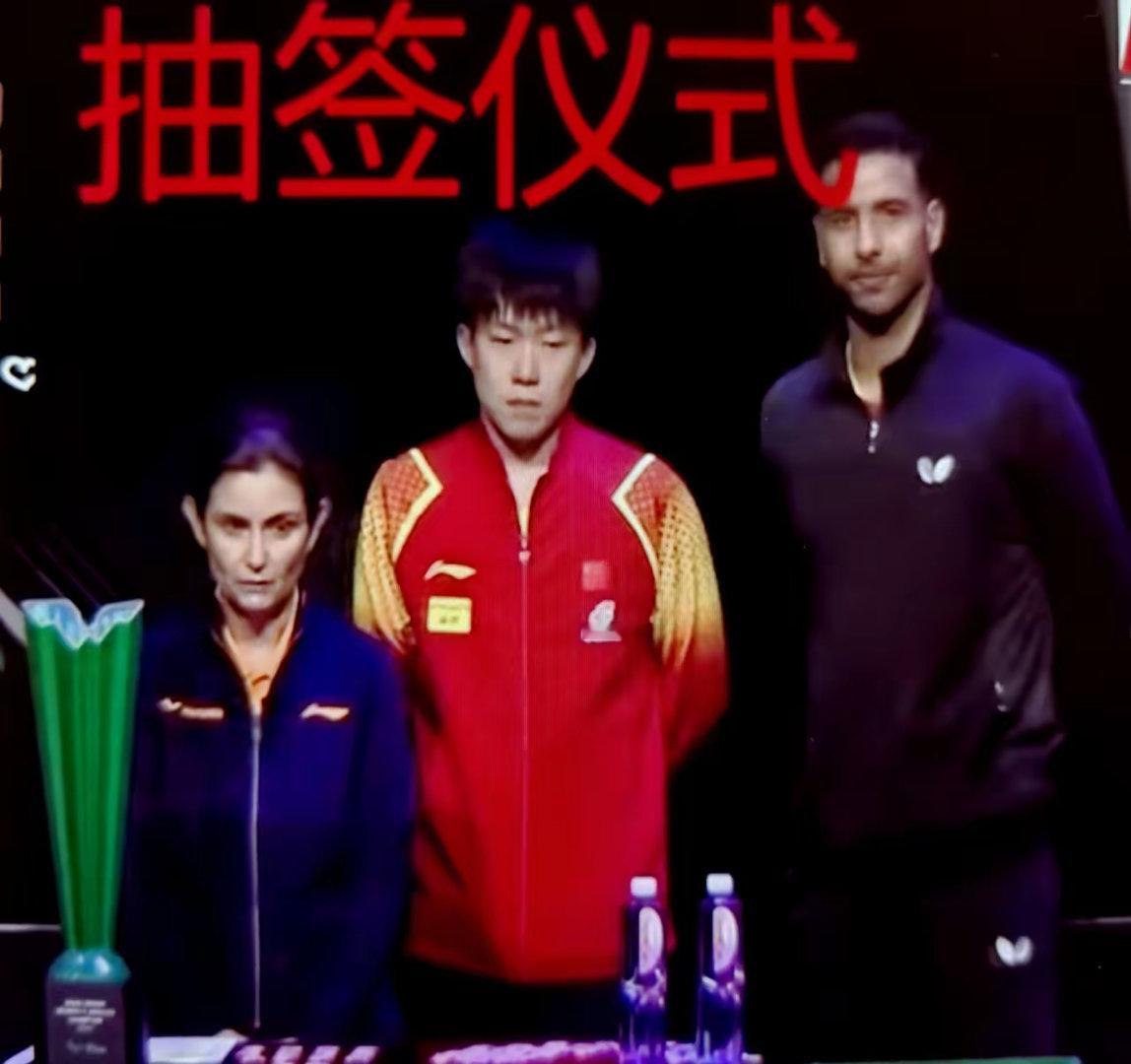 在亚锦赛抽签仪式上,另外两个队员姿势表情单一,就是在例行公事。