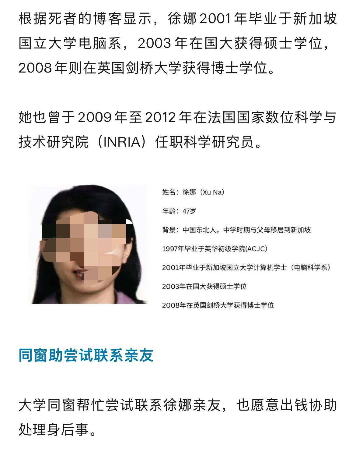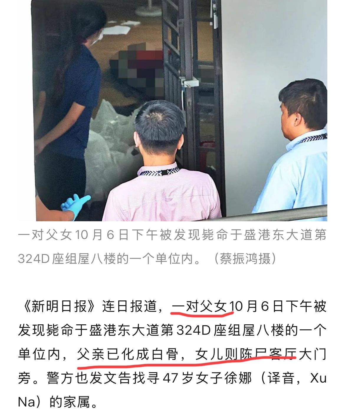 悲伤! 新加坡出现双尸案! 据新加坡当地媒体报道, 屋内发现父女两人尸体, 其中父亲已化作白骨, 女儿也早已去世! 女子今年47岁,中学时跟随父母移民到新加坡, 她学习很好,学历很高。 后来不知道怎么了, 好像得上了精神方面的疾病, 母亲早些年已经去世, 她跟随父亲生活。 警方猜测, 大概是父亲病死后, 女子可能没人照顾, 是活活饿死的! 她当年出国读书, 也许是学习压力太大,也许是天性要强,也可能母亲的早逝对她打击很大, 也许是社会竞争太激烈,等等,各种因素都压在了她身上… 人的一生, 能健康的活着, 有的时候挺难的, 真的要注意心理健康! 新加坡现父女双亡案 新加坡 心理健康 出国