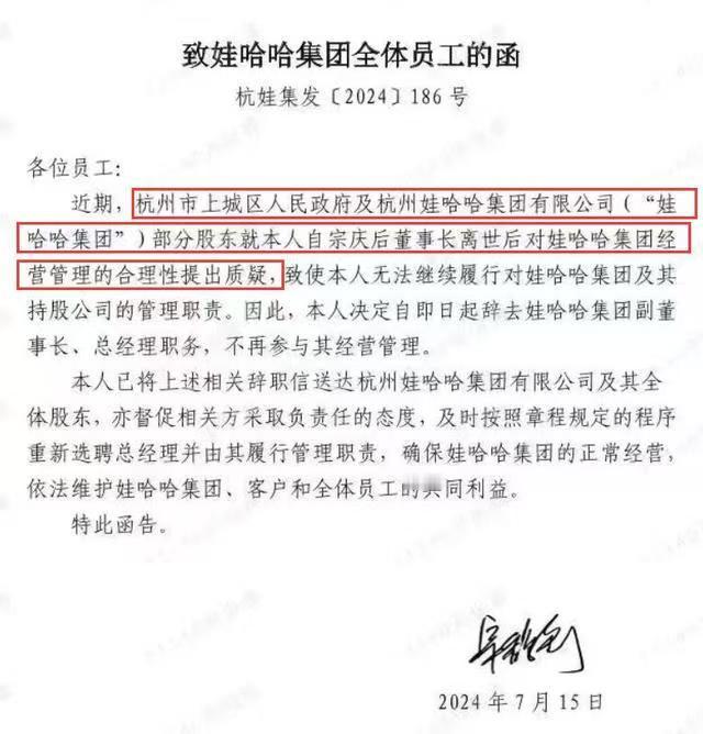 宗馥莉辞职了,她于9月12日就已经向董事会提交了辞职信,这次会不会和上次一样,是以退为进的策略呢。 还记得上次,即2024年7月15日,她丢出了一个函,意思是有股东对她的经营管理合理性提出质疑,所以她打算辞去总经理职务。 通过这个公开函,造成了舆论,也给反对者施压,所以,经过一番博弈,她算是赢了,管理层也换上了自己的人。 也有了后续一系列的动作,比如把员工合同签到宏盛集团,把娃哈哈员工持股会的股权收购了。 从而把娃哈哈空心化,利用宏盛抽走娃哈哈大部分利润,踢走了杜建英系和宗庆后家族的关联企业。 看来,她也预感到了风雨即将到来,所以启用了新商标,如今,正式辞职,应该是不会正式脱离娃哈哈。 准备在宏盛集团大干一场了,只不过随着严学峰被调查,是不是真的能独善其身呢?