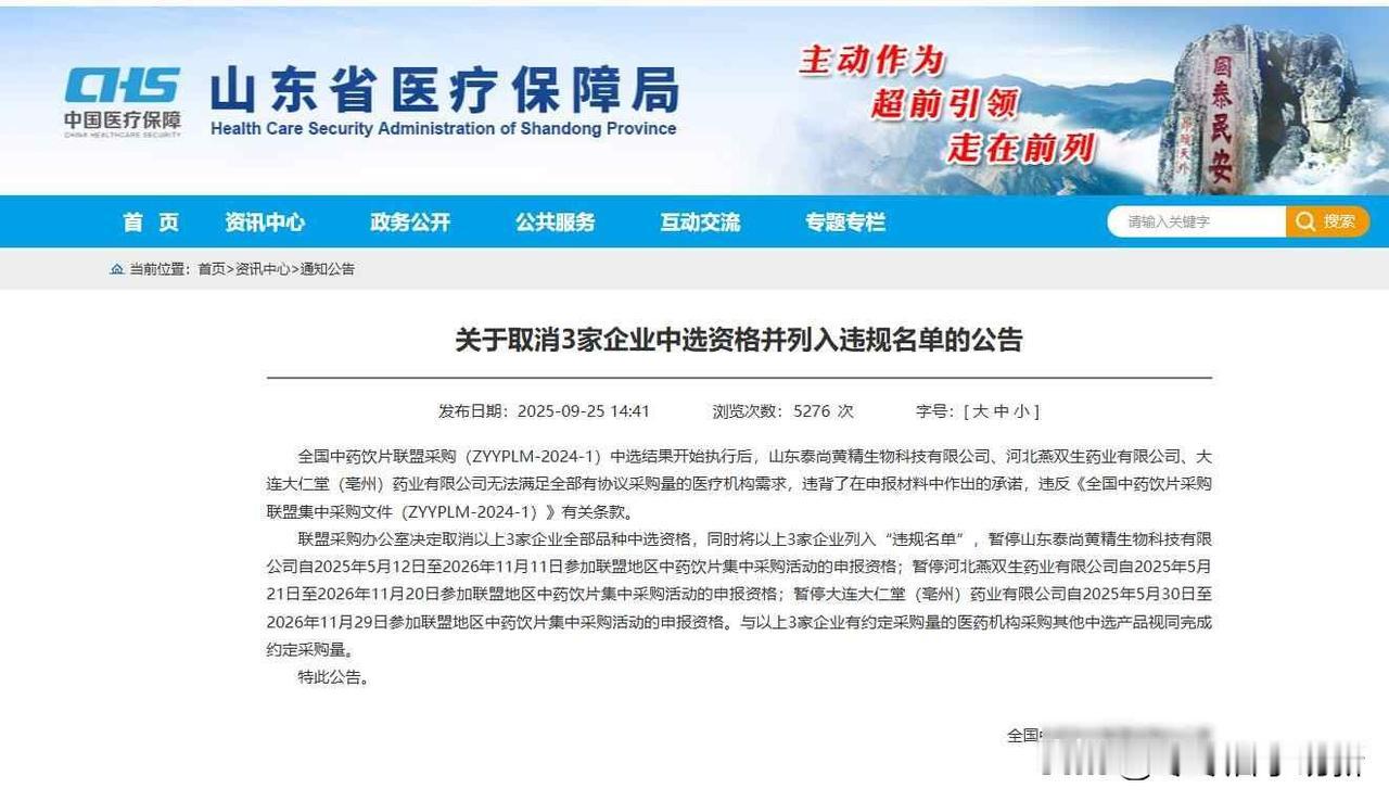 黄精企业被踢出集采,农业跨界踩雷,谁来兜底药房缺货? 2025年10月,山东泰尚黄精、河北燕双生、大连大仁堂三家被官方点名清退,因为没按合同供货,违反了中药饮片集采的规定,结果是取消中选资格,十八个月内不得再投标,医院还能买其他中选的产品,病人拿药不受影响。 山东泰尚黄精是泰安市国资委旗下的农业公司,主要种黄精,搞旅游,卖黄精茶、黄精酒这类健康食品,2020年才成立,刚拿到Pre-A轮融资,不是老药厂,也没生产过药品,想靠“泰山黄精”这个牌子,从农产品转到医药圈,想法是不错,但现实没那么好走。 它有1560亩种植基地,林下经济也做得像那么回事,但药品不是菜市场的大白菜,医院要的是稳定供货、质量能盯得住、随时能补上货,泰尚黄精没建GMP车间,没配专业物流,也没本事应付突发订单,它把保健品当药品卖,供应链根本撑不住,政策没说农业企业不能进集采,也没分清种药材的和制药的该不该用一套标准。 有人觉得农业企业进药圈是好事,能带点农村发展,也让中药更贴近生活,但有人不这么看,集采是签了合同的买卖,不是拿来试错的,药是给人治病的,不能因为企业没经验就让病人等药、换药,江苏以前有菌菇企业冲进集采,结果被约谈后悄悄退出,这种事不是头一回,说明审核这块还没跟上。 查了天眼查,这三家公司都不是空壳,泰尚黄精的注册资本全缴齐了,背后也有资本在撑着,问题不在钱多钱少,而在本事不够,它们太把品牌当回事,对生产流程和应急反应却不上心,老百姓也开始问了,黄精茶到底能不能当药吃,保健食品和中药饮片到底有啥区别,监管得赶紧把界限划清楚,不然大家真容易被糊弄。 这次清退不是随便搞搞,它说明中药集采不能只看谁报价低,还得看企业能不能按时把货送够,农业企业想进医药行业,光有地头优势没用,得能过工业生产的硬标准,以后可能要分两种企业,一种是专门做药的,一种是跨界来的,各自定不同的准入条件和履约考核,现在没这规矩,最后受累的还是医院和患者。